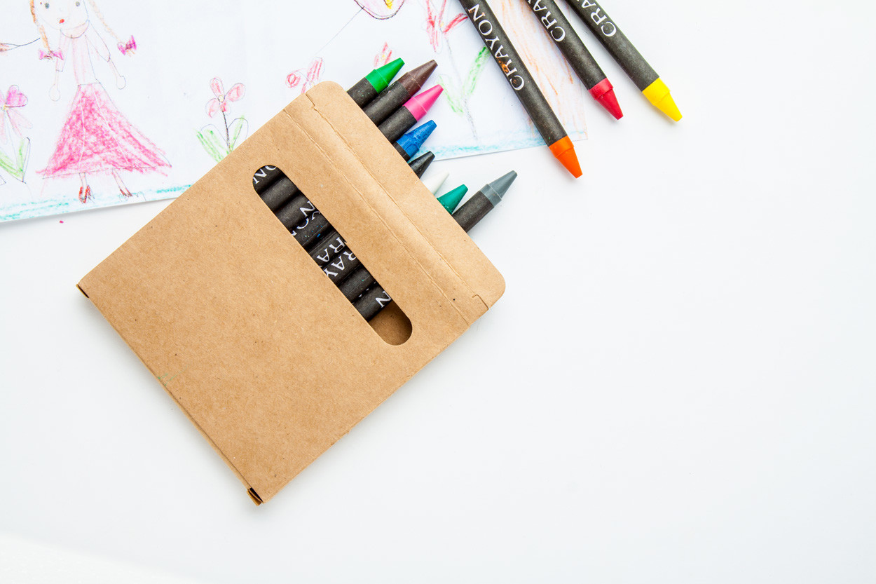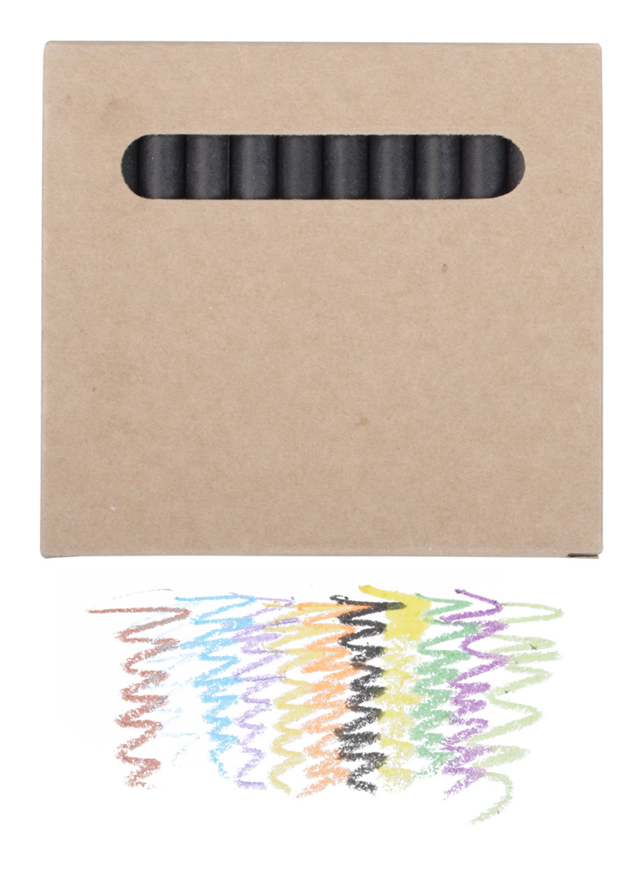 12 db-os fekete papírral bevont színes zsírkrétakészlet, barna, ablakos papírdobozban.