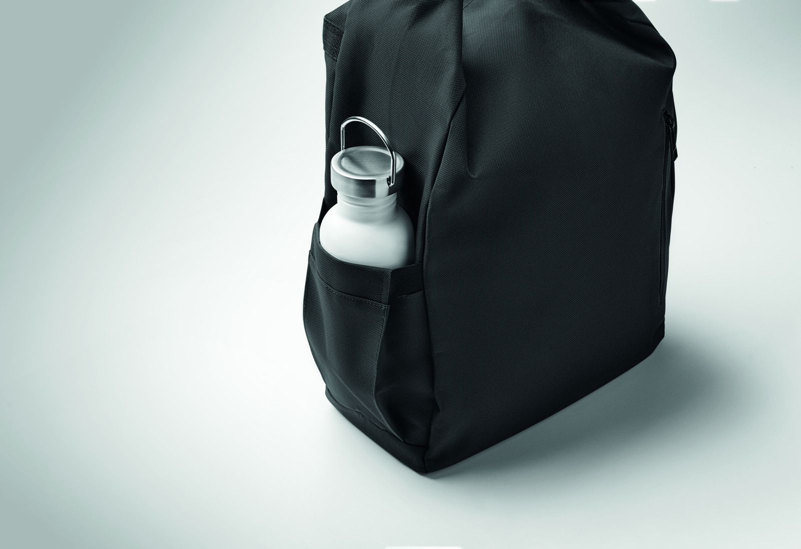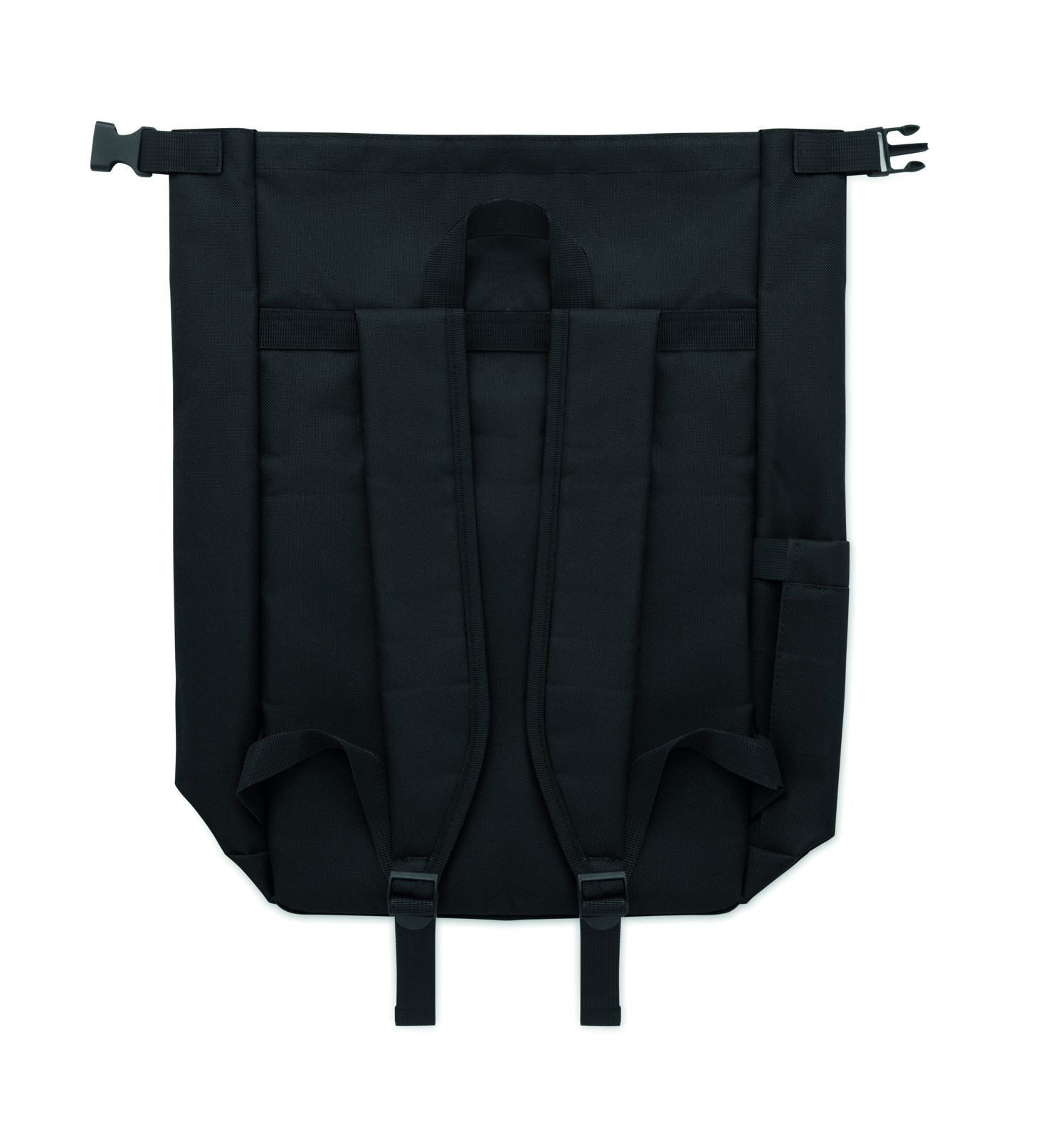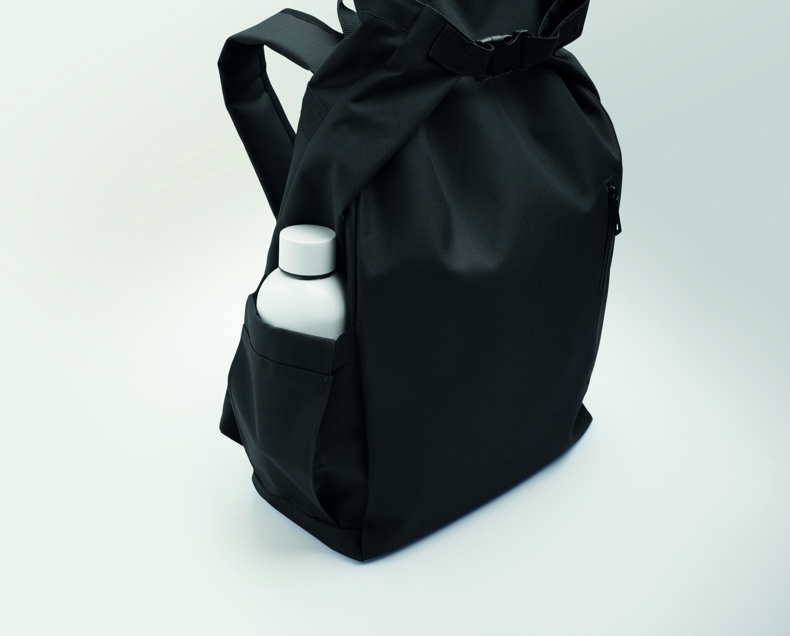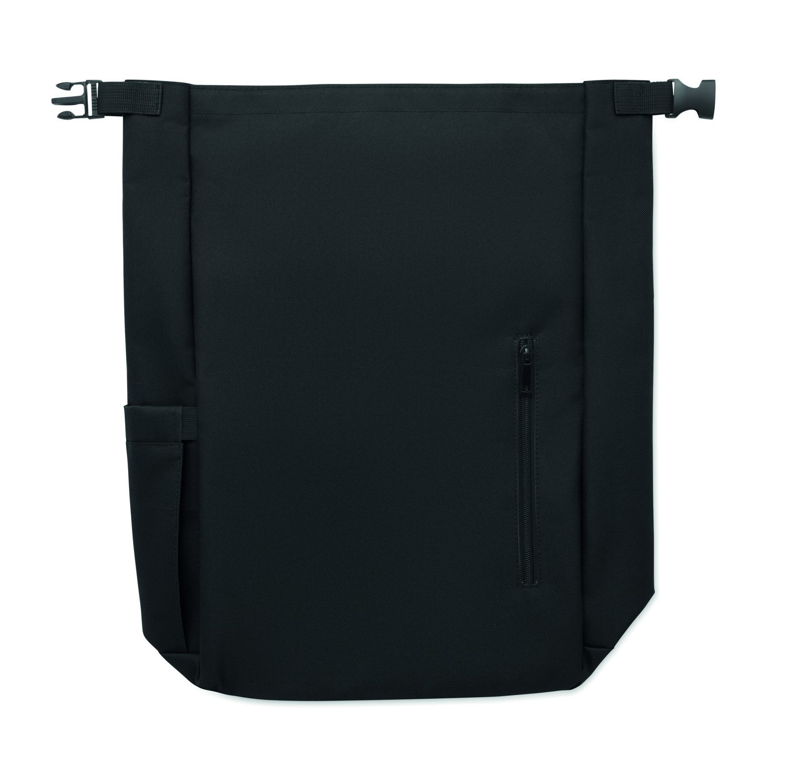 15 colos, csavart záródású rolltop laptop hátizsák 600D RPET poliészterből, párnázott 210D RPET béléssel. Cipzáras elülső zsebbel, rugalmas oldalzsebbel és állítható vállpántokkal.