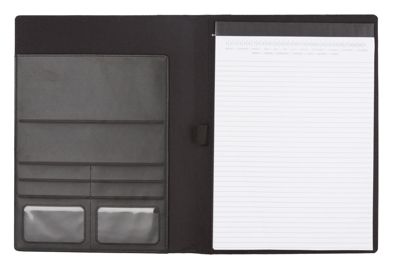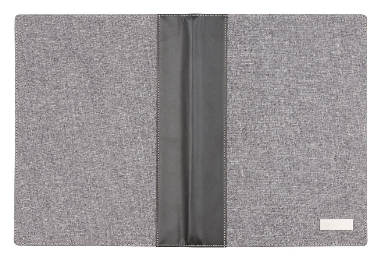 Vászon és PU bőr borítású A4-es iratmappa, 20 lapos vonalas jegyzettömbbel. Borítón jól emblémázható fém lemez található.