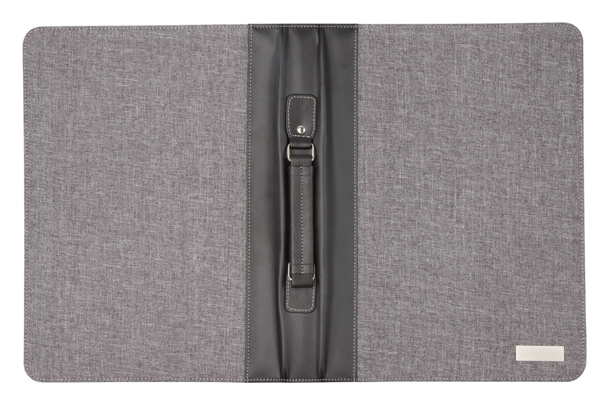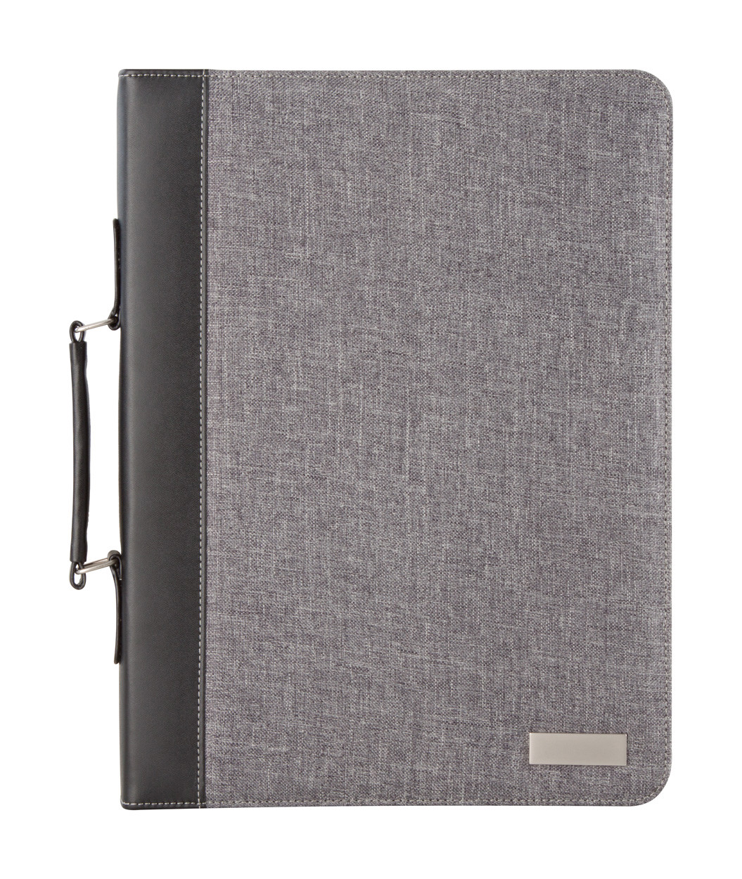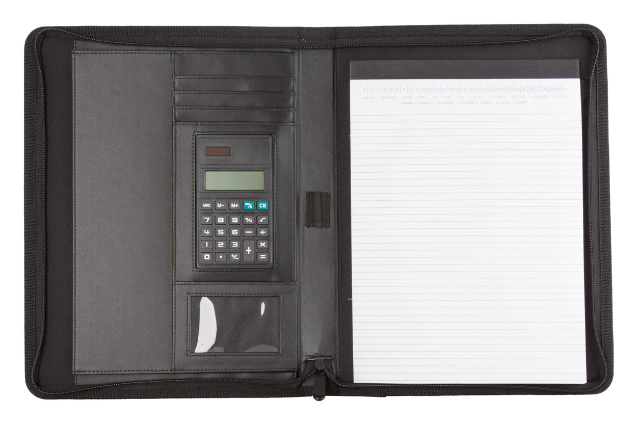 Vászon és PU bőr borítású A4-es cipzáras iratmappa hordfüllel, 20 lapos vonalas jegyzettömbbel, napelemes számológéppel. A borítón jól emblémázható fémlemez található.