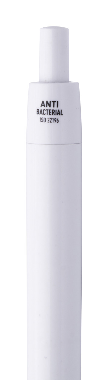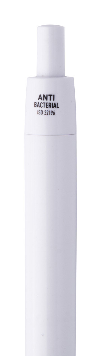 Antibakteriális műanyag golyóstoll, kék tollbetéttel. Nano ezüst adalékanyagot tartalmaz, megakadályozva a baktériumok szaporodását a toll testén. ISO 22196 szabványnak megfelel.