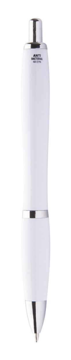Antibakteriális műanyag testű golyóstoll króm részekkel. Nano ezüst adalékanyagot tartalmaz, megakadályozva a baktériumok szaporodását a toll testén. Nyomómechanizmussal működik és kék tollbetéttel szállítjuk. ISO 22196 szabványnak megfelel.