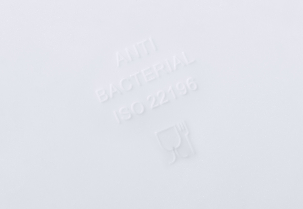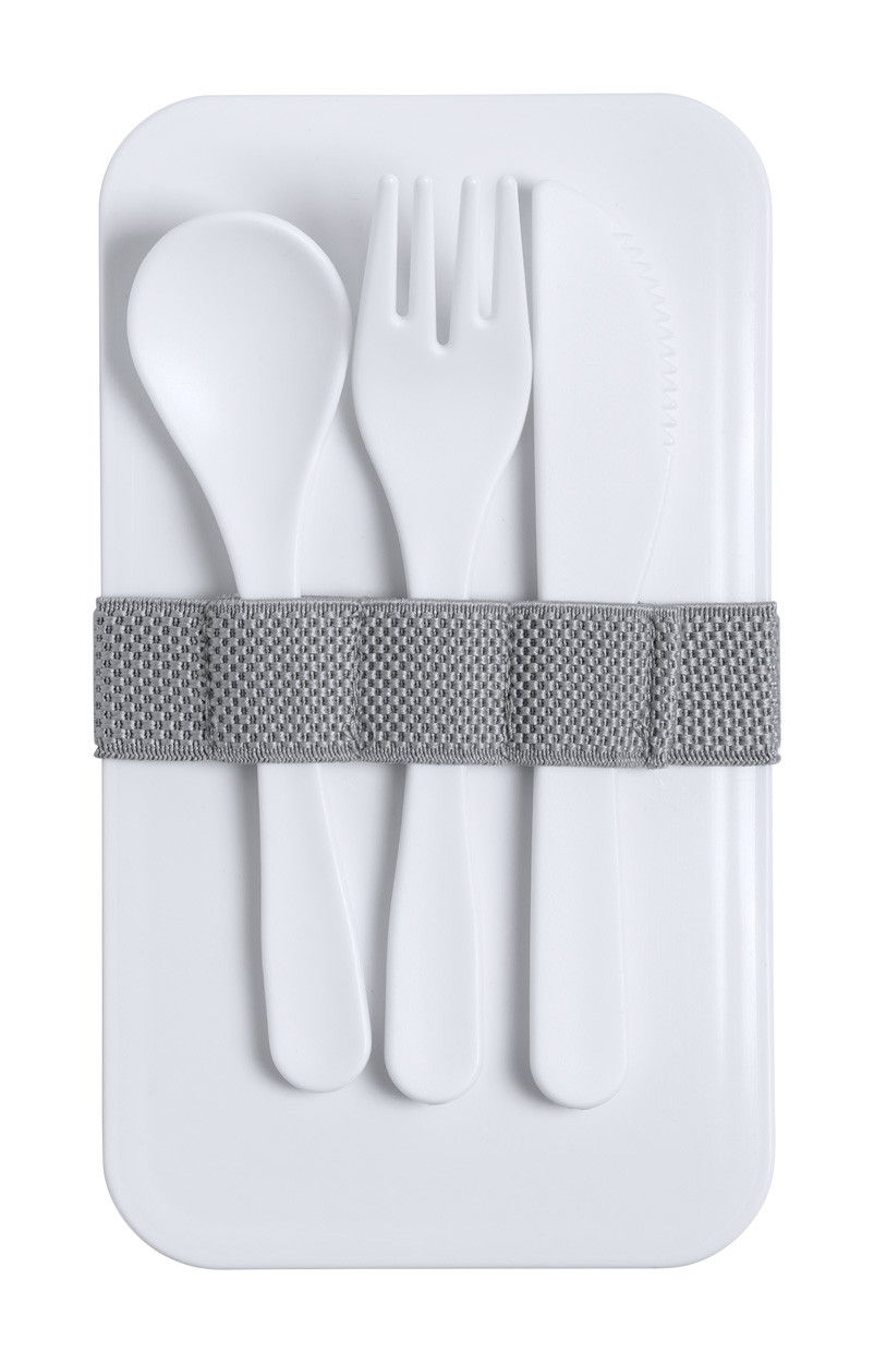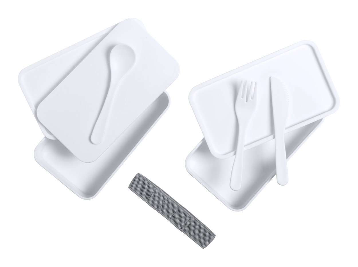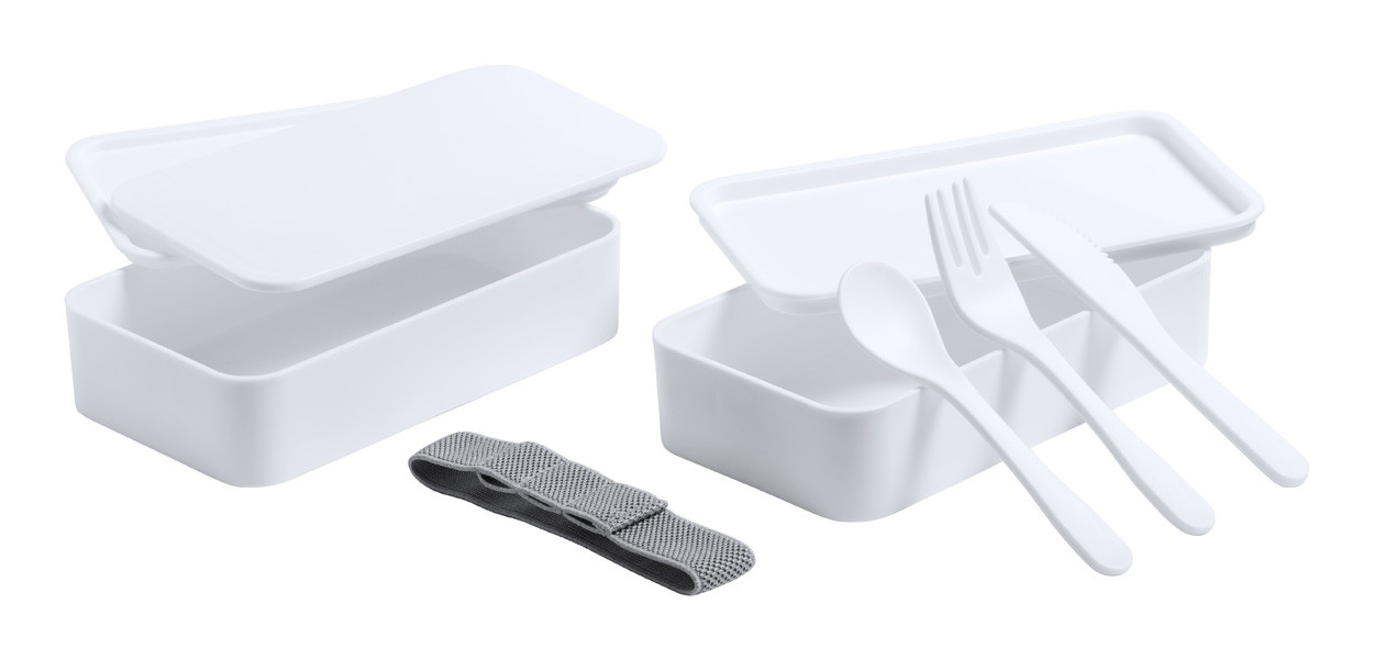 Antibakteriális műanyag uzsonnás doboz, evőeszköz készlettel (kés, villa és kanál) és gumipánttal. Két, egyenként 700 ml kapacitású rekesszel. ISO 22196 szabványnak megfelel.