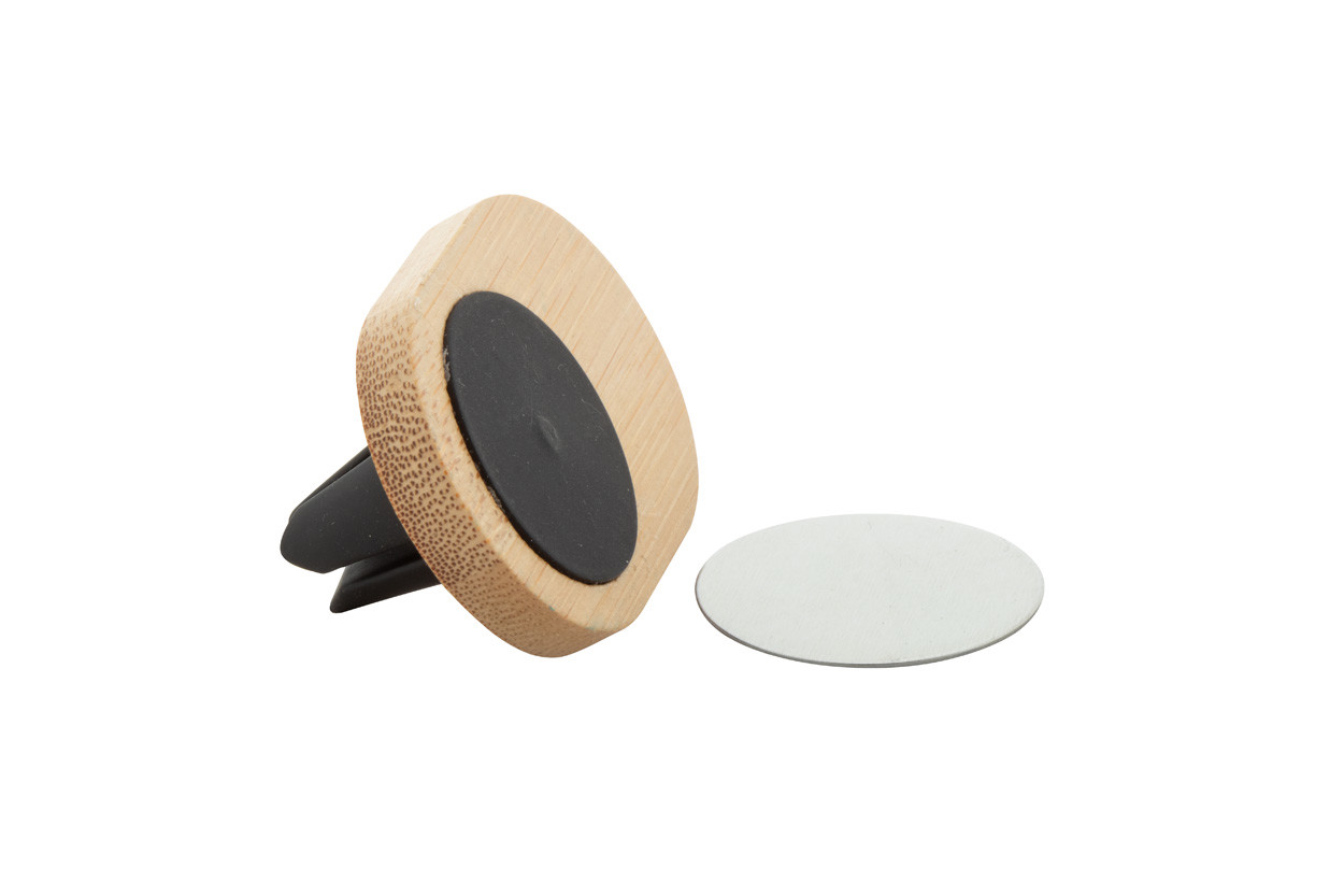 Mágneses, bambuszból készült autós mobiltartó, szellőzőre rögzíthető. Öntapadó fémlemezzel együtt, kraft papír dobozban szállítjuk.