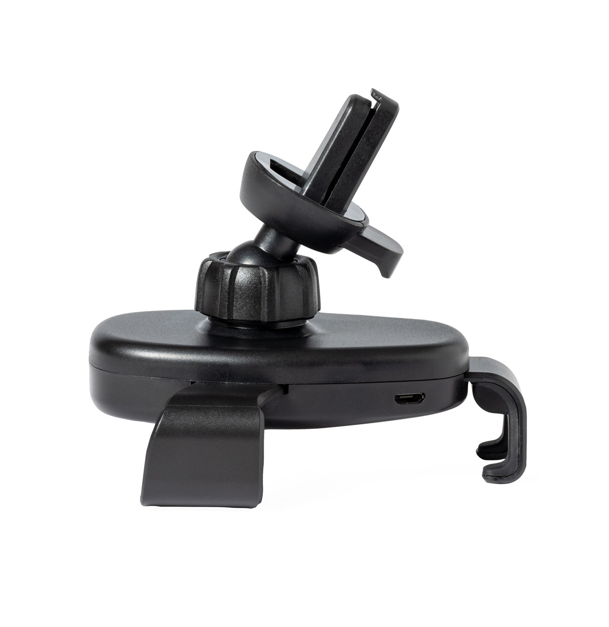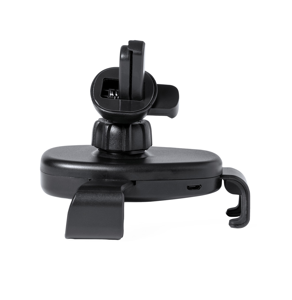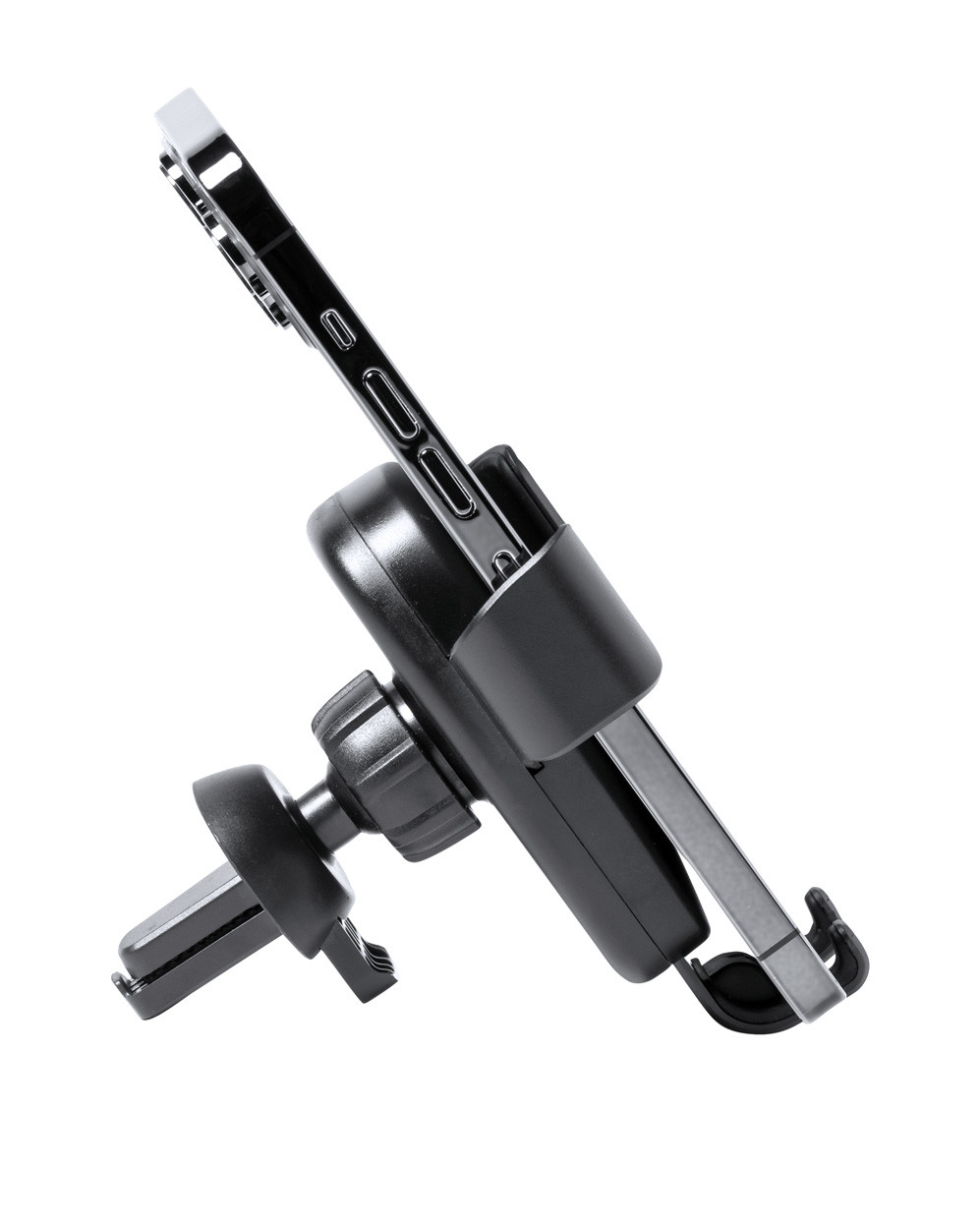 ABS műanyag autós mobiltelefon tartó beépített vezeték nélküli gyorstöltővel (10 W) és állítható rögzítéssel. USB töltőkábellel szállítjuk.