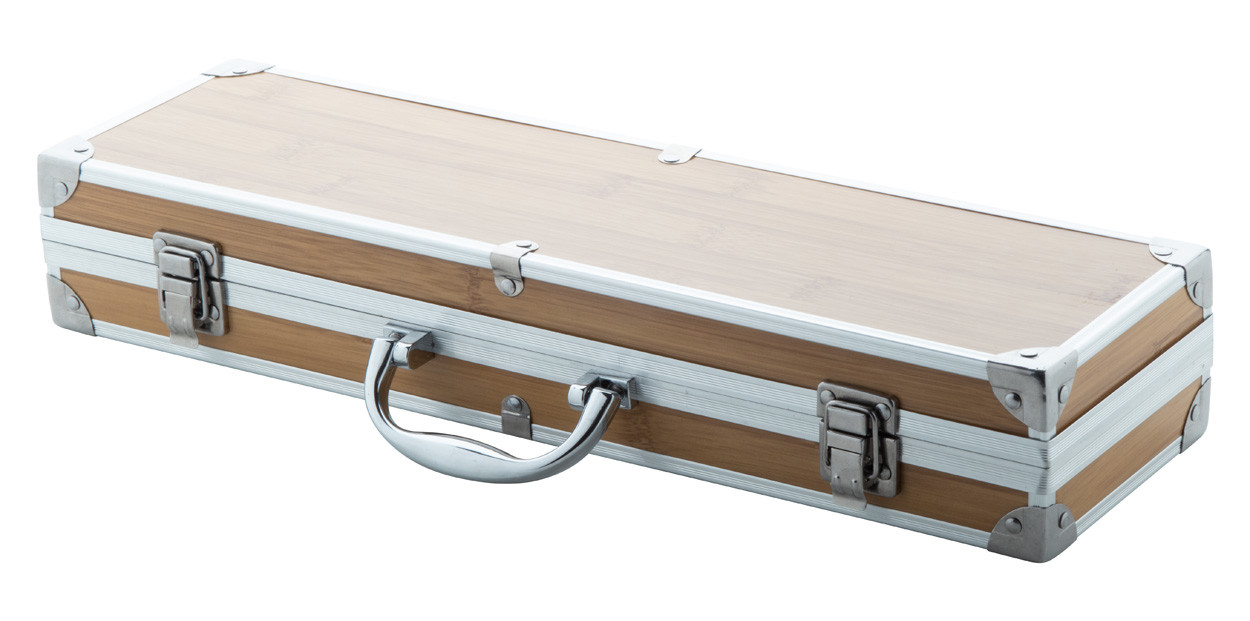 3 darabos grillszett rozsdamentes acélból és bambuszból (villa, csipesz, lapát, üvegnyitó). Bambusz mintájú alumínium tárolóban szállítjuk.