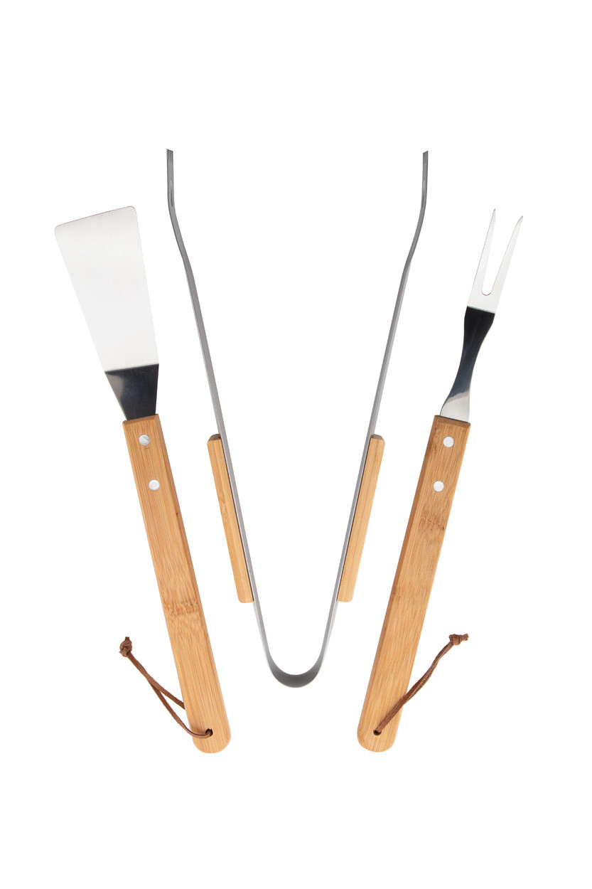 3 db-os rozsdamentes acél grillszett (villa, csipesz, lapát) bambusz fogantyúval, kraft papír dobozban.