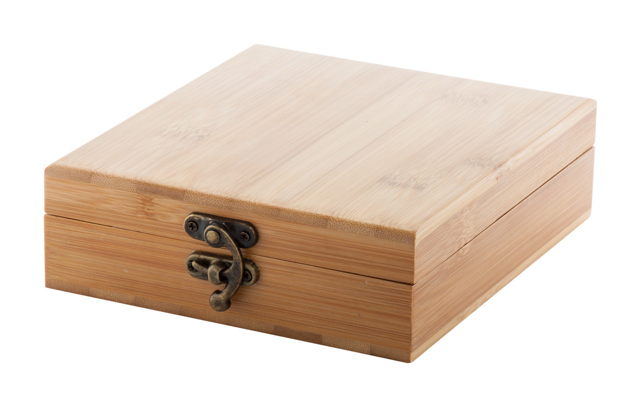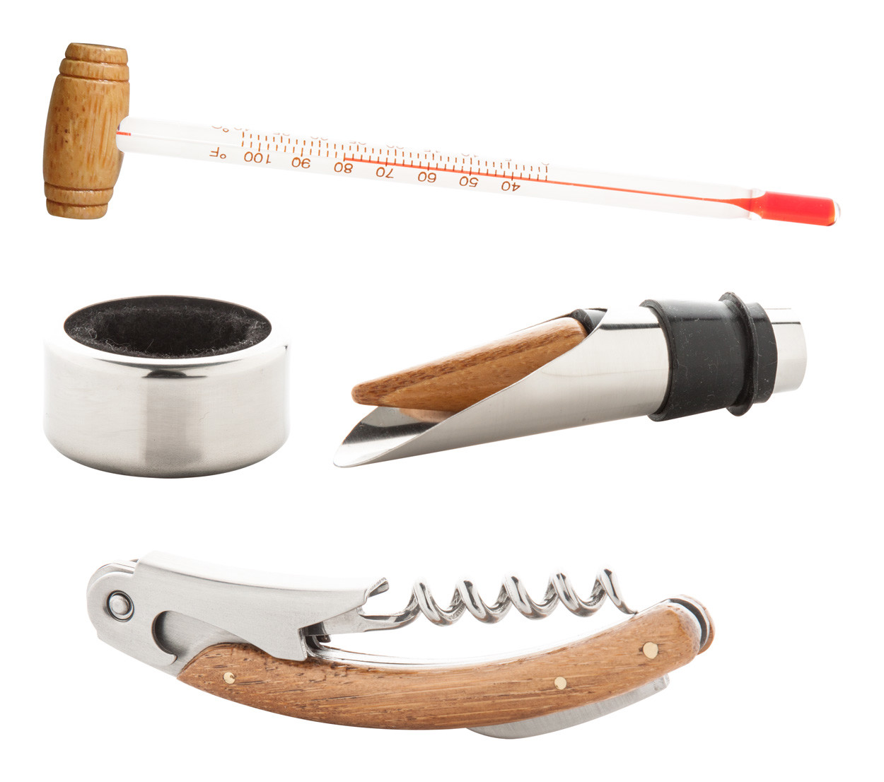 4 részes faberakású boros szett bambusz dobozban, mely bornyitót, cseppőrt, kiöntőt és borhőmérőt tartalmaz.