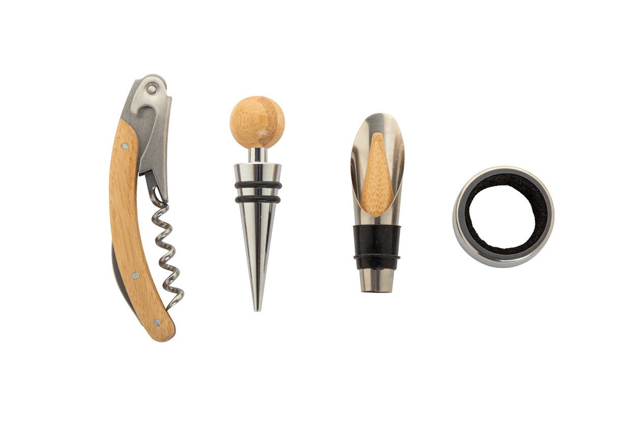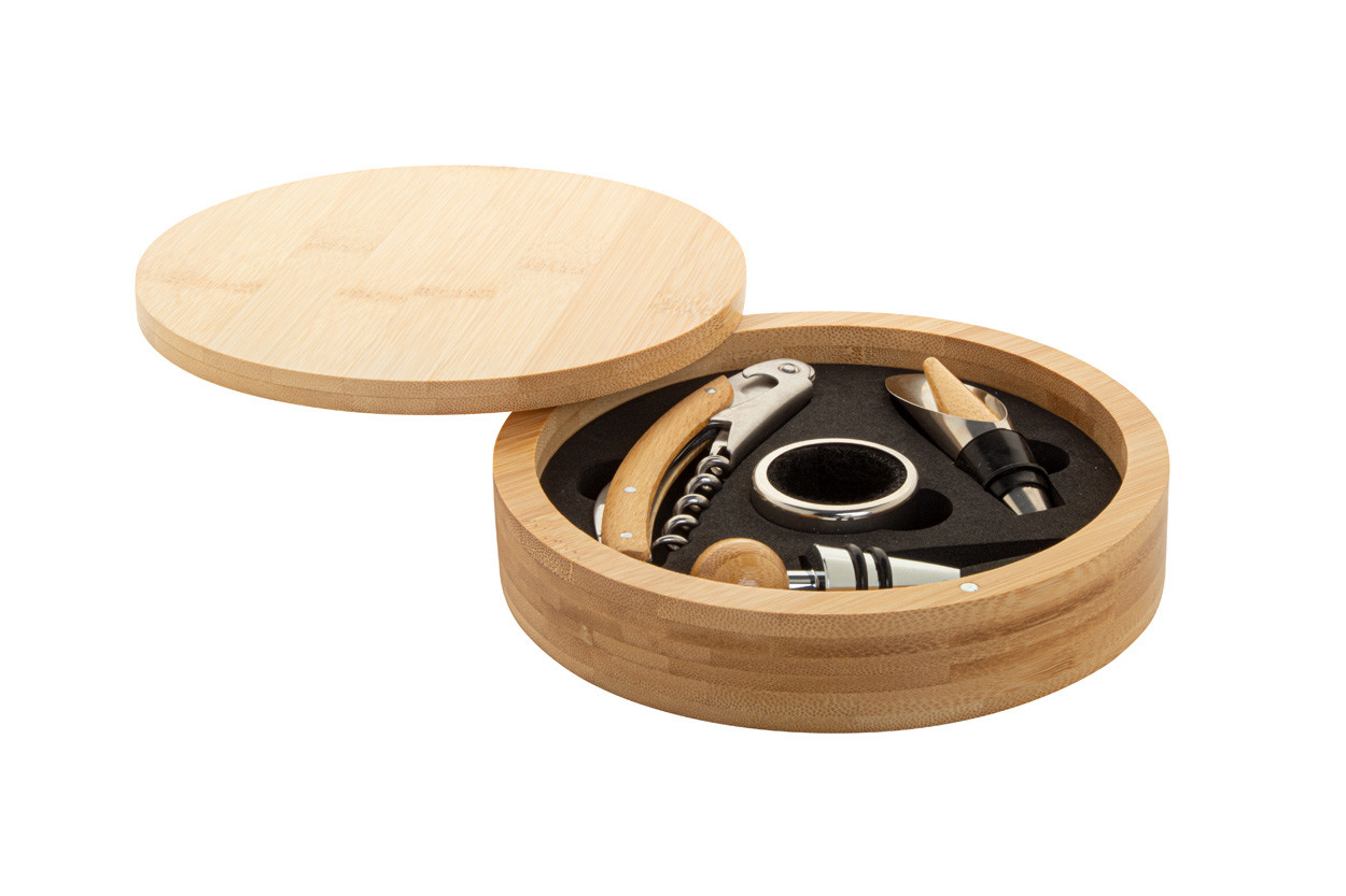 4 db-os bambusz berakású, rozsdamentes acél boros szett kerek bambusz dobozban. Dugóhúzóval, cseppőrrel, kiöntővel és záródugóval.