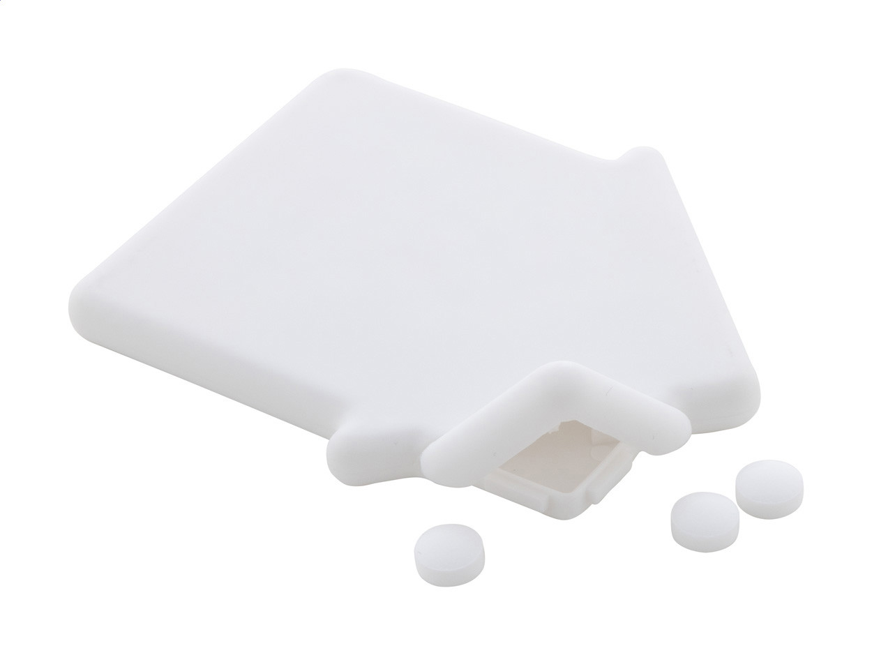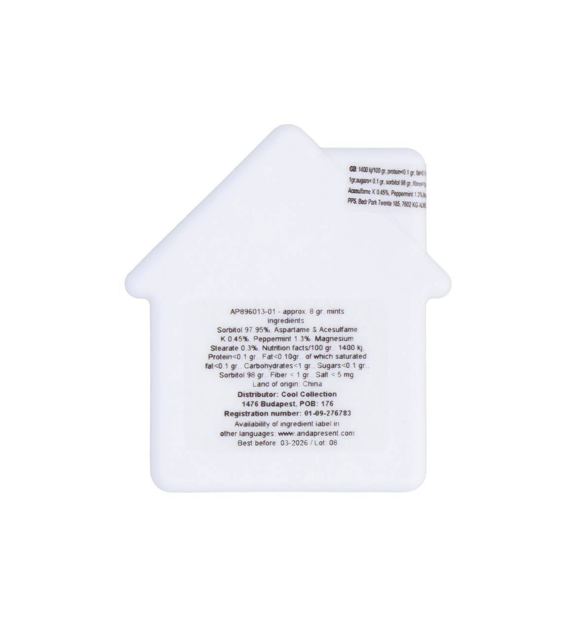 Házikó alakú műanyag cukorka adagoló, kb. 8 gramm cukormentes mentolos cukorkával.