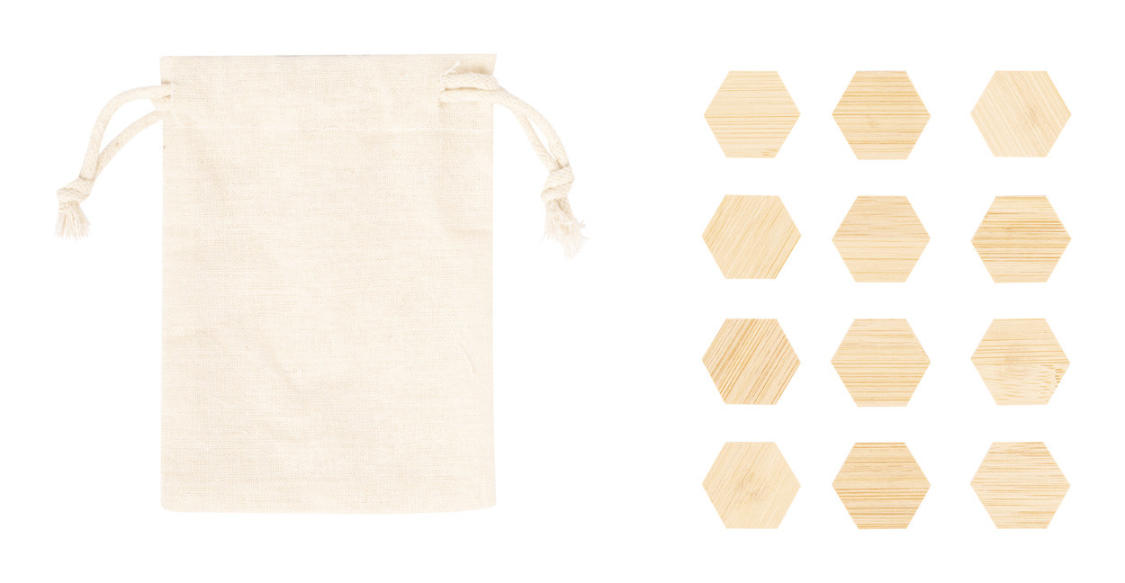 12 db-os bambusz hűtőmágnes készlet, pamut zsinóros tasakban.