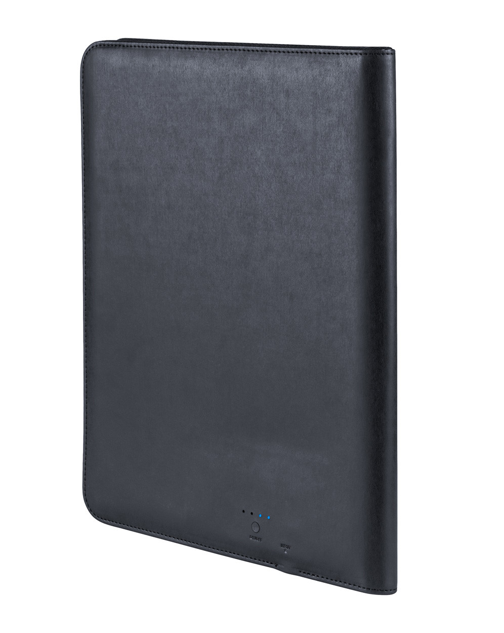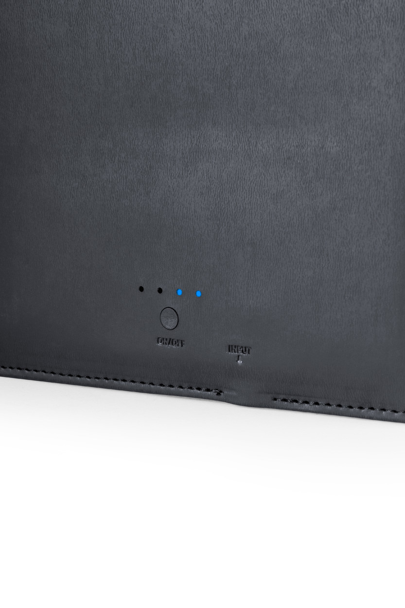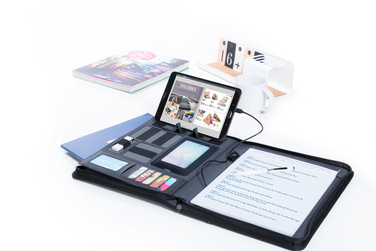 PU bőr irattartó 5000 mAh külső akkumulátorral, 20 lapos jegyzetfüzettel és mobil-, és tablet tartó résszel. USB csatlakozóval szállítjuk.