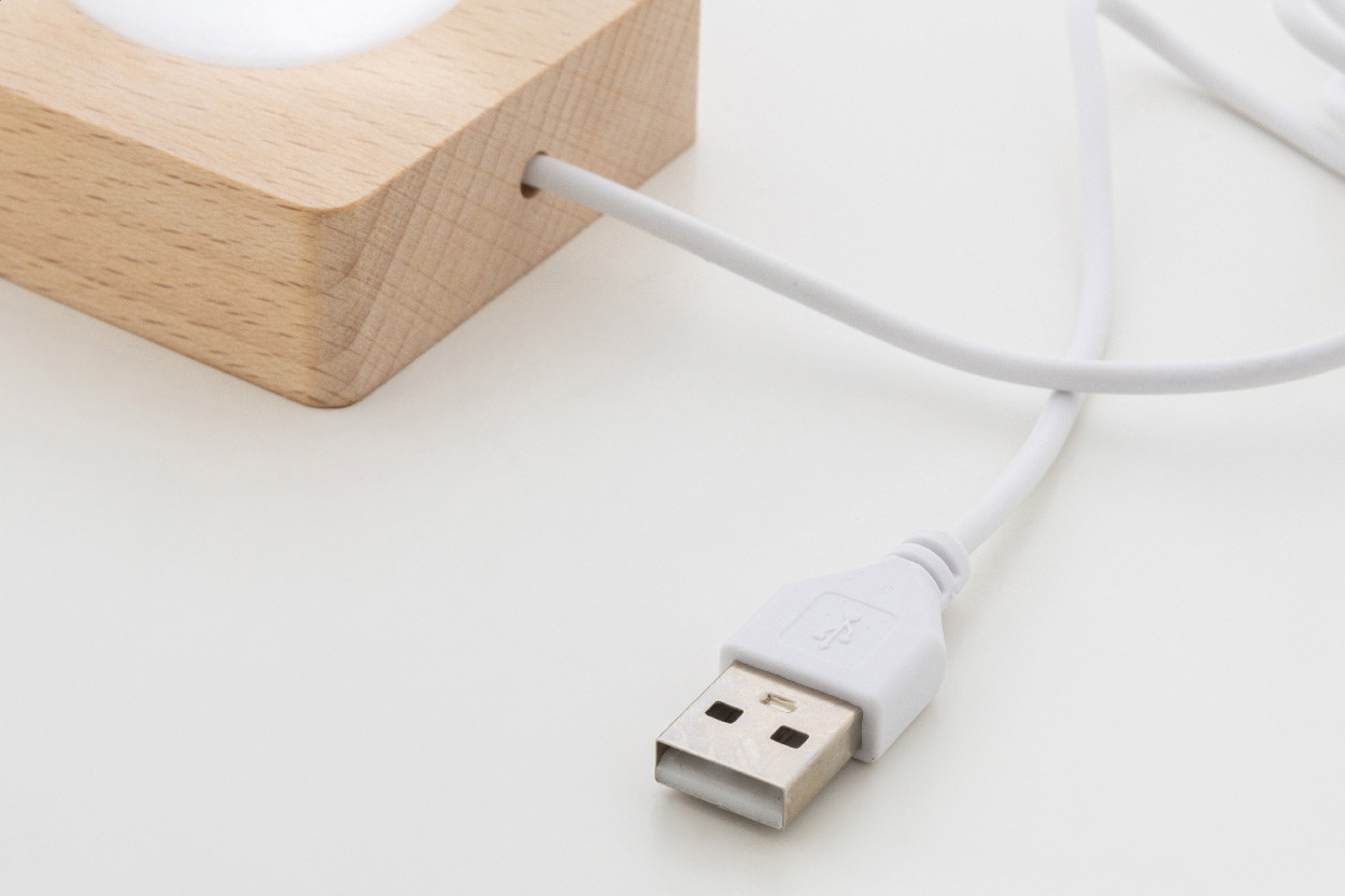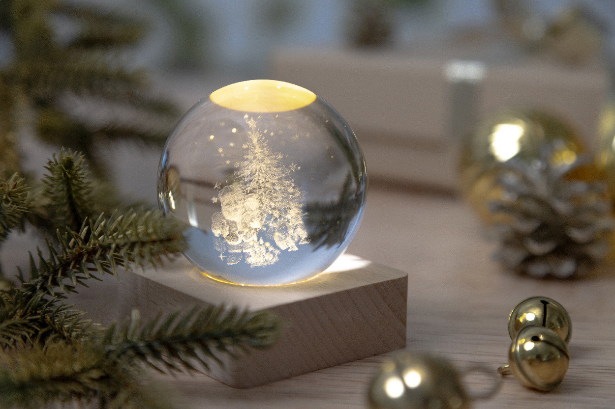 Üveg karácsonyi fénygömb fából készült LED-es égőtalppal. USB töltőkábellel.