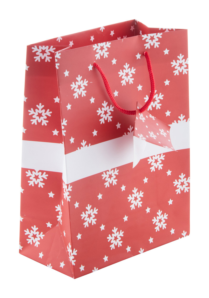 Matt, laminált papírtáska karácsonyi mintával, fehér nyomási felülettel és ajándékkísérővel.