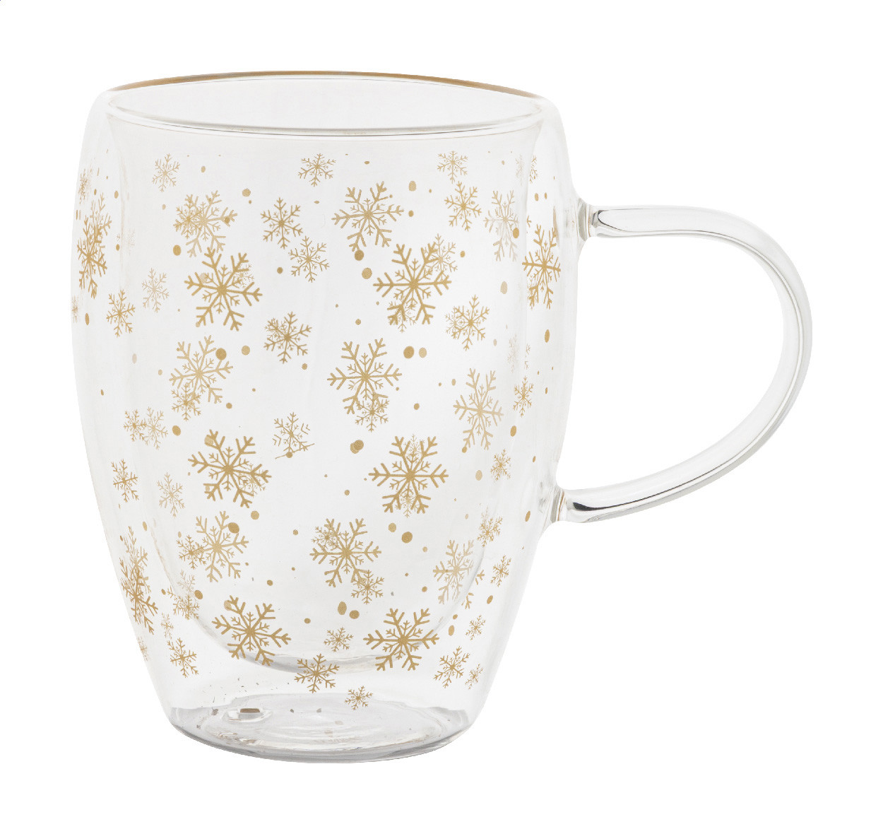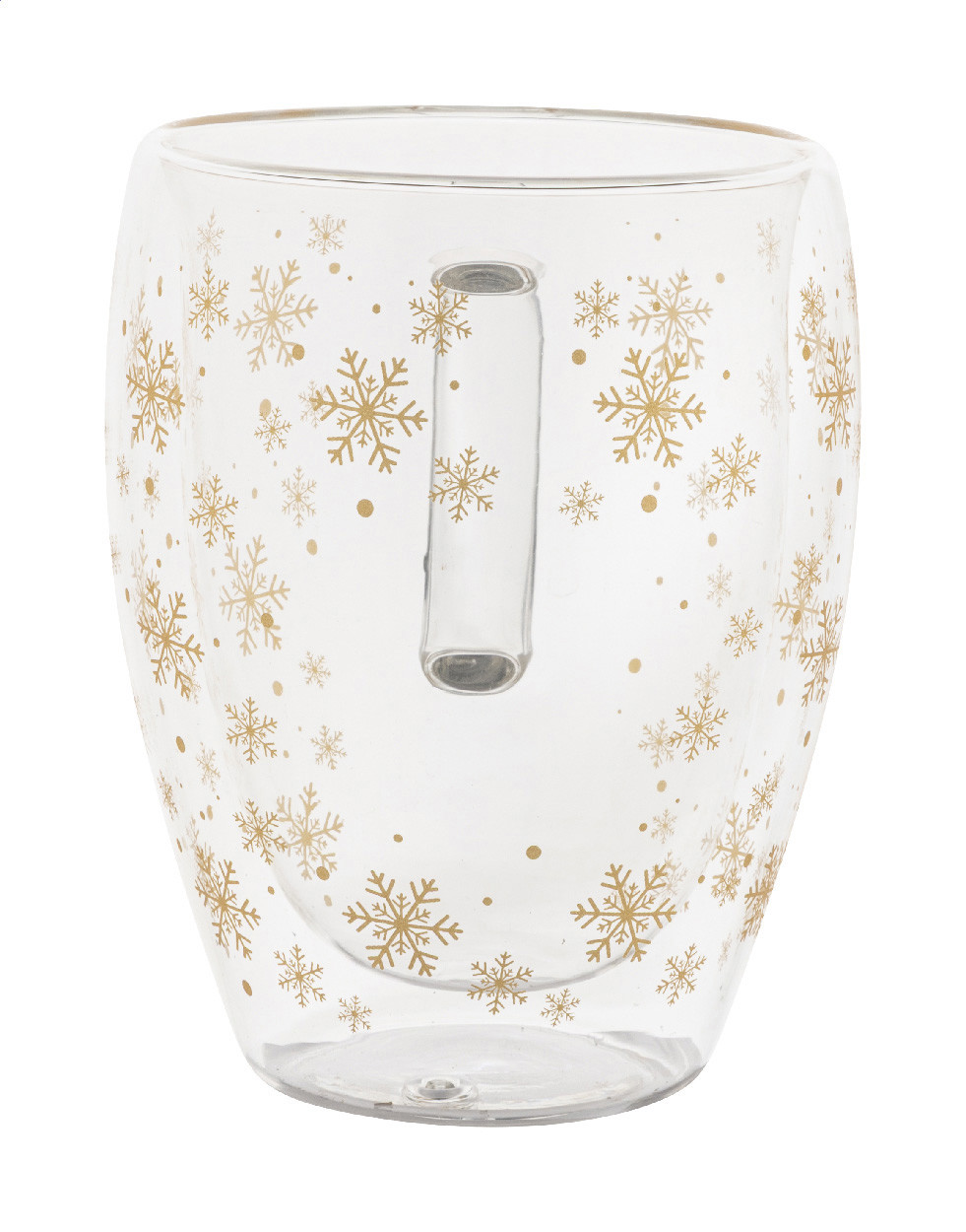 Duplafalú, boroszilikát üvegből készült thermo bögre karácsonyi hópehely mintával, 350 ml. Kraft papír dobozban.