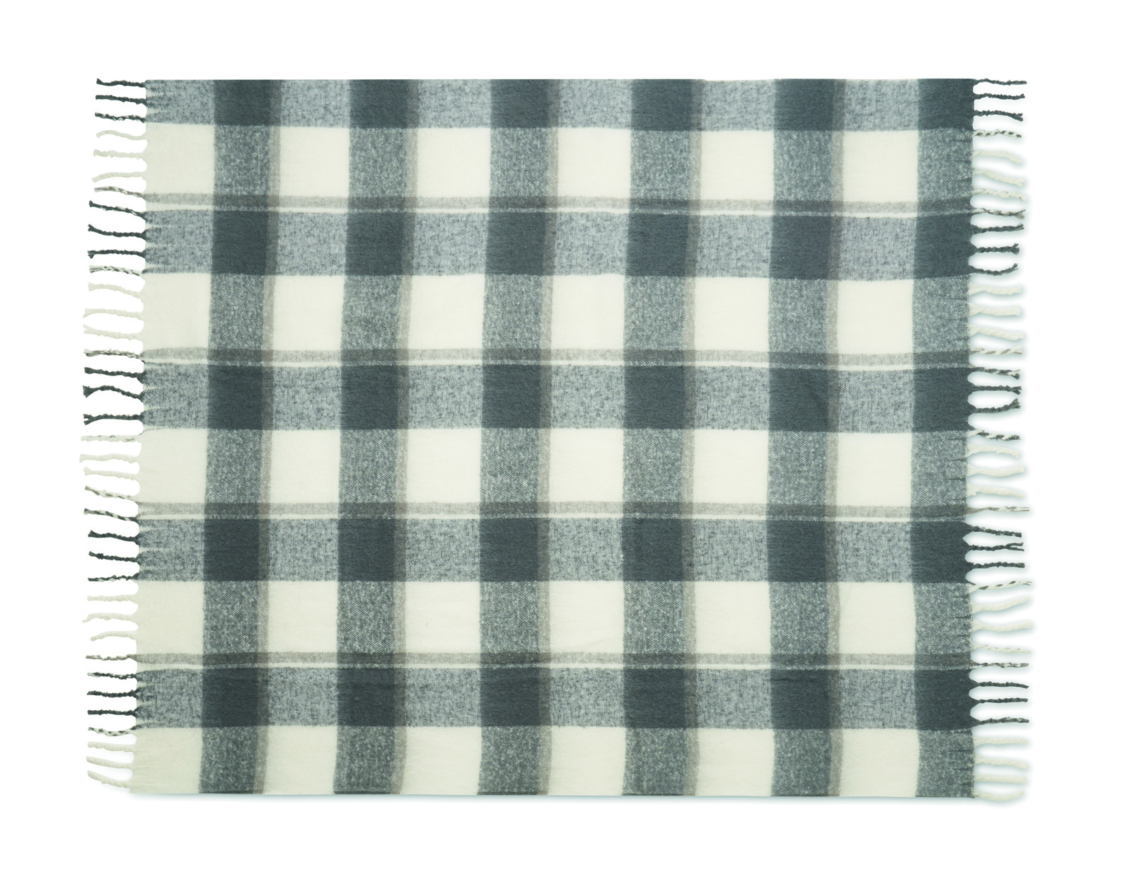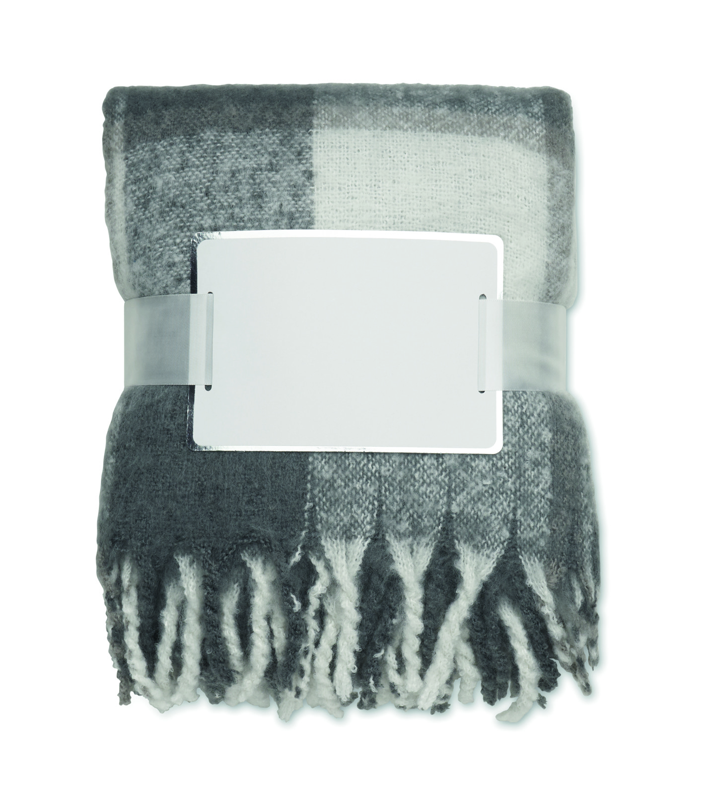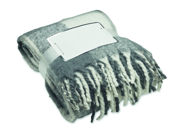 Kockás mintás mohair-RPET poliészter takaró sodort rojtokkal. Szalaggal átkötve, emblémázható kártyával szállítjuk.