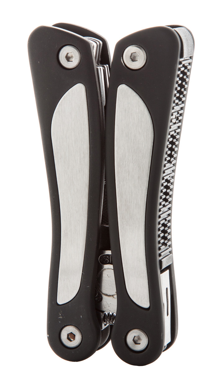 Multifunkciós, rozsdamentes, acél bicska 9 funkcióval: reszelő, olló, 3 féle csavarhúzó, 2 méretű kés, üvegnyitó, csipesz.