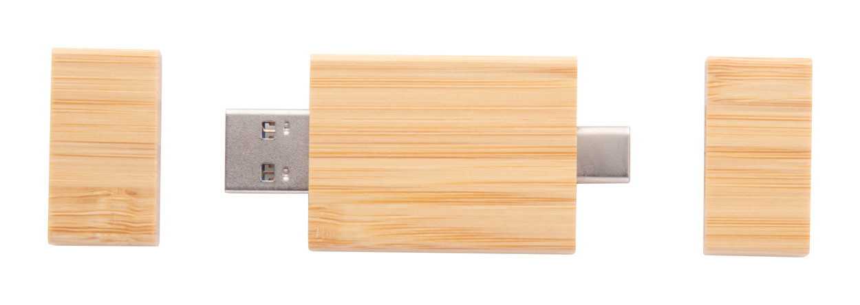 OTG USB pendrive bambuszból, 4/8/16/32 GB memóriával. USB és USB-C csatlakozással, kraft papír tasakban. USB 2.0.