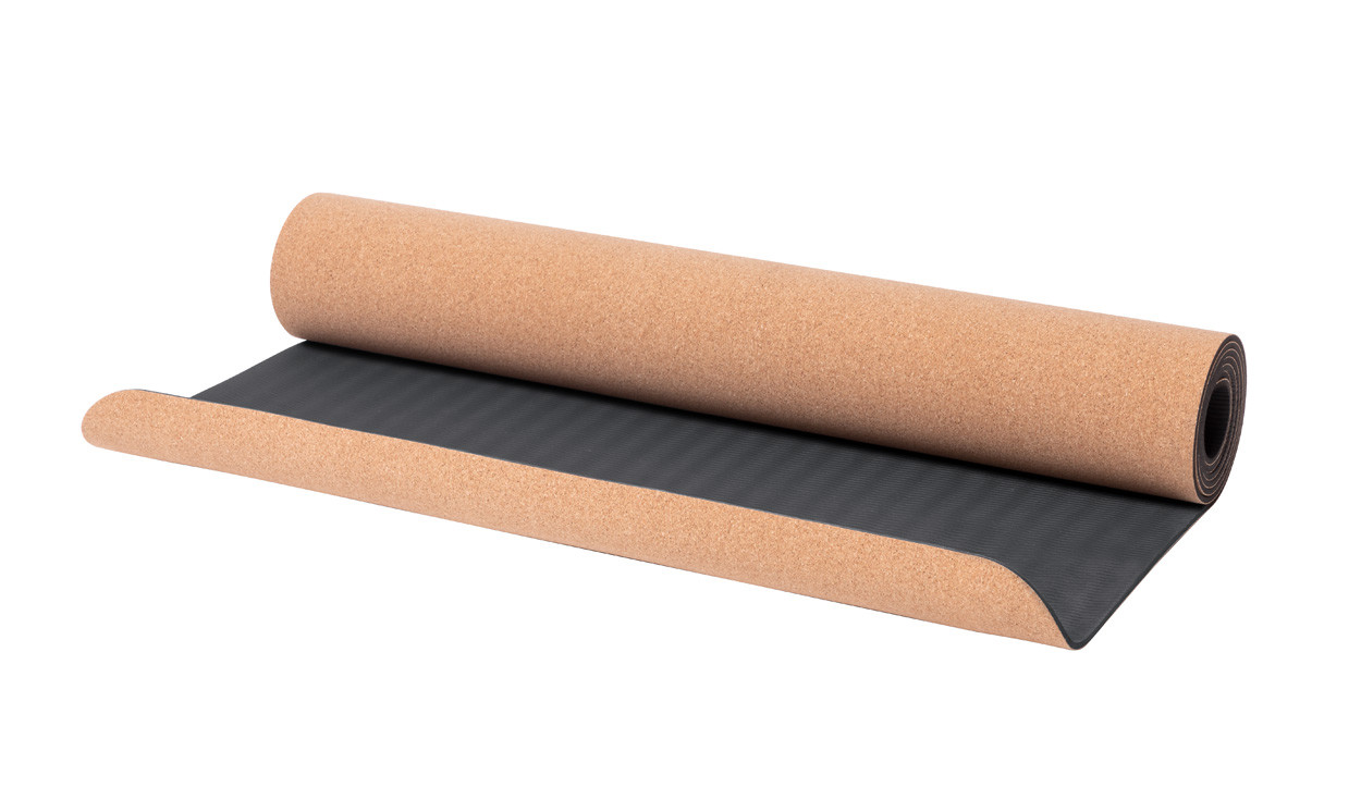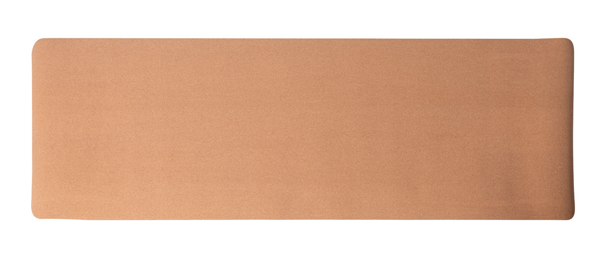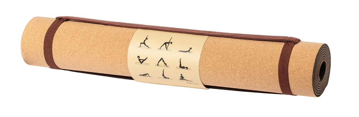 Természetes parafa jógamatrac, kraft papírgyűrűvel és hordfüllel.
