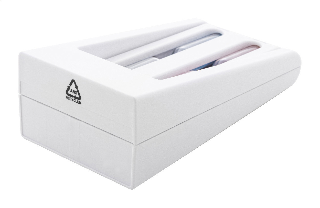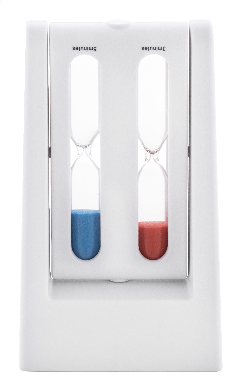 Újrahasznosított ABS műanyagból készült homokóra, forgó 3 és 5 perces homokórákkal.
