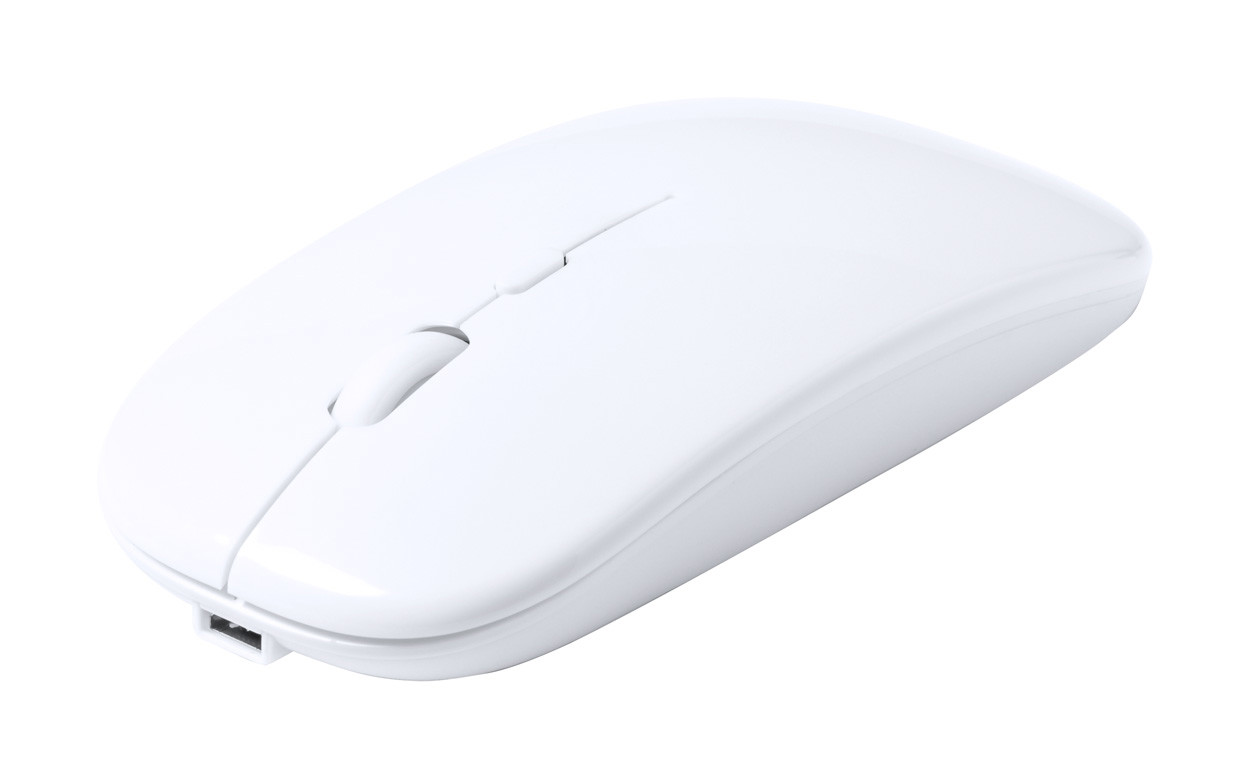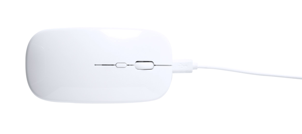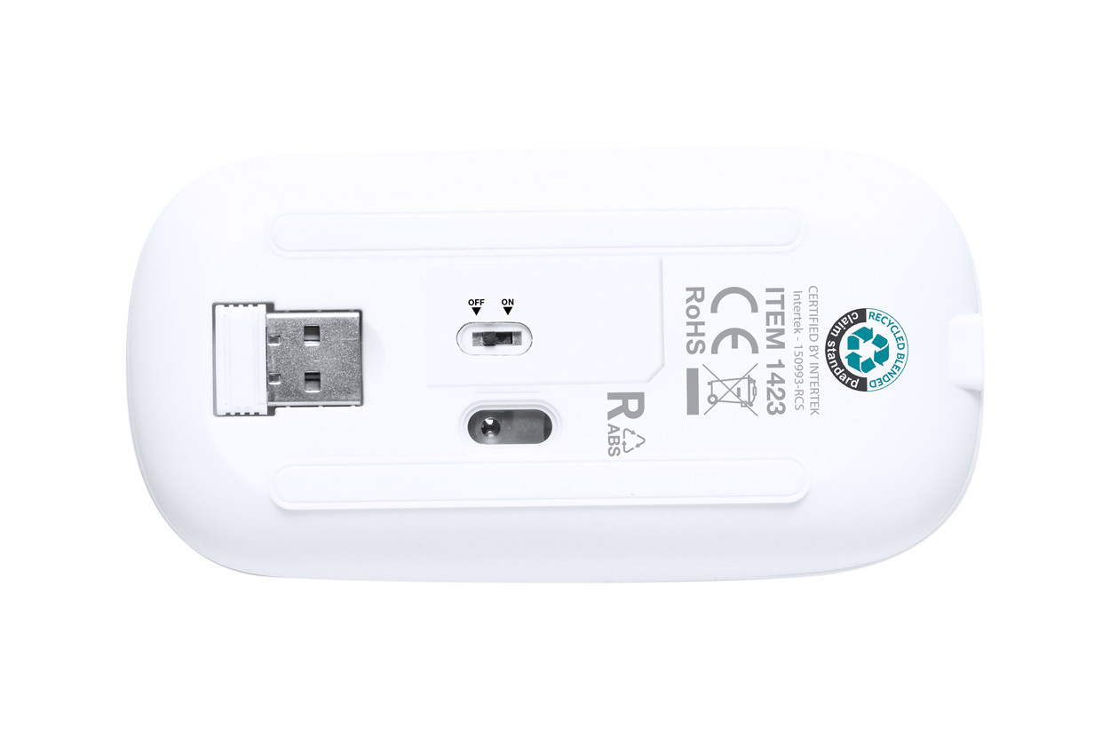 Újrahasznosított ABS műanyag optikai egér beépített újratölthető akkumulátorral. USB töltőkábellel szállítjuk.