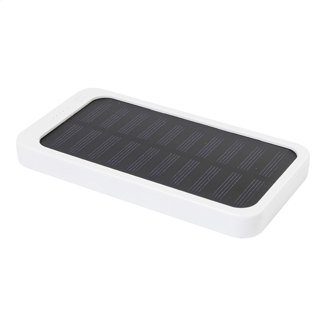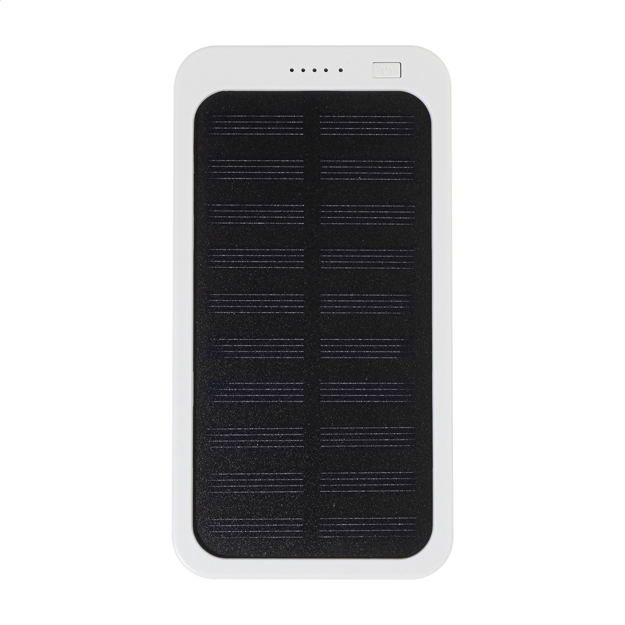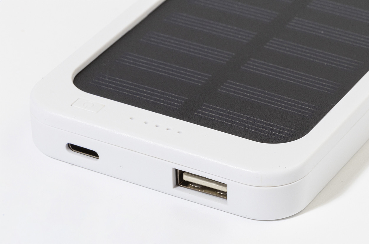 Újrahasznosított ABS műanyag power bank beépített napelemes töltővel és 4000 mAh-s akkumulátorral. 1 USB és 1 USB-C töltőporttal. USB-C bemeneti porttal. USB töltőkábellel.