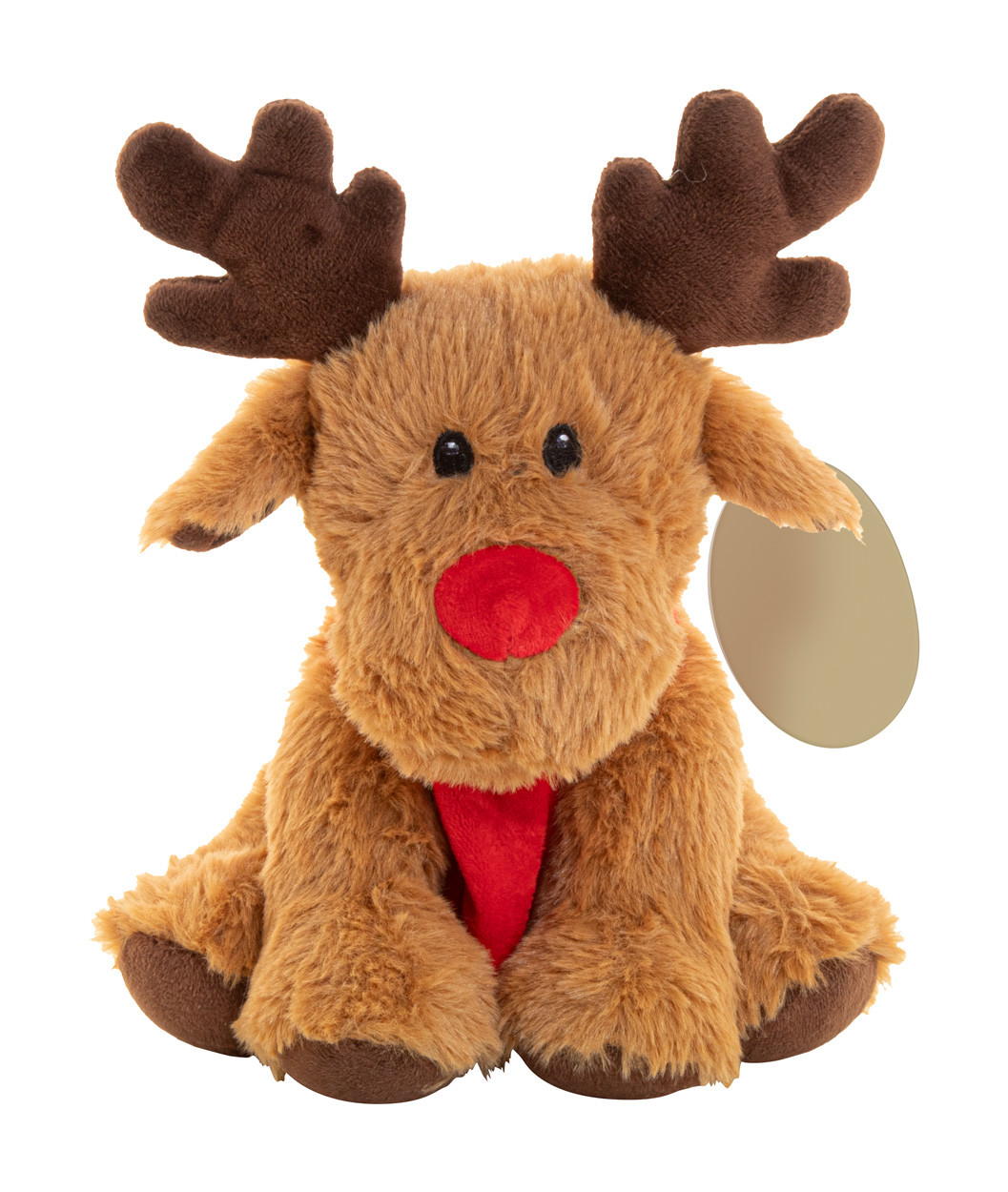 RPET plüss karácsonyi rénszarvas sállal. Emblémázható, kraft papírból készült akasztós címkével a fülén.