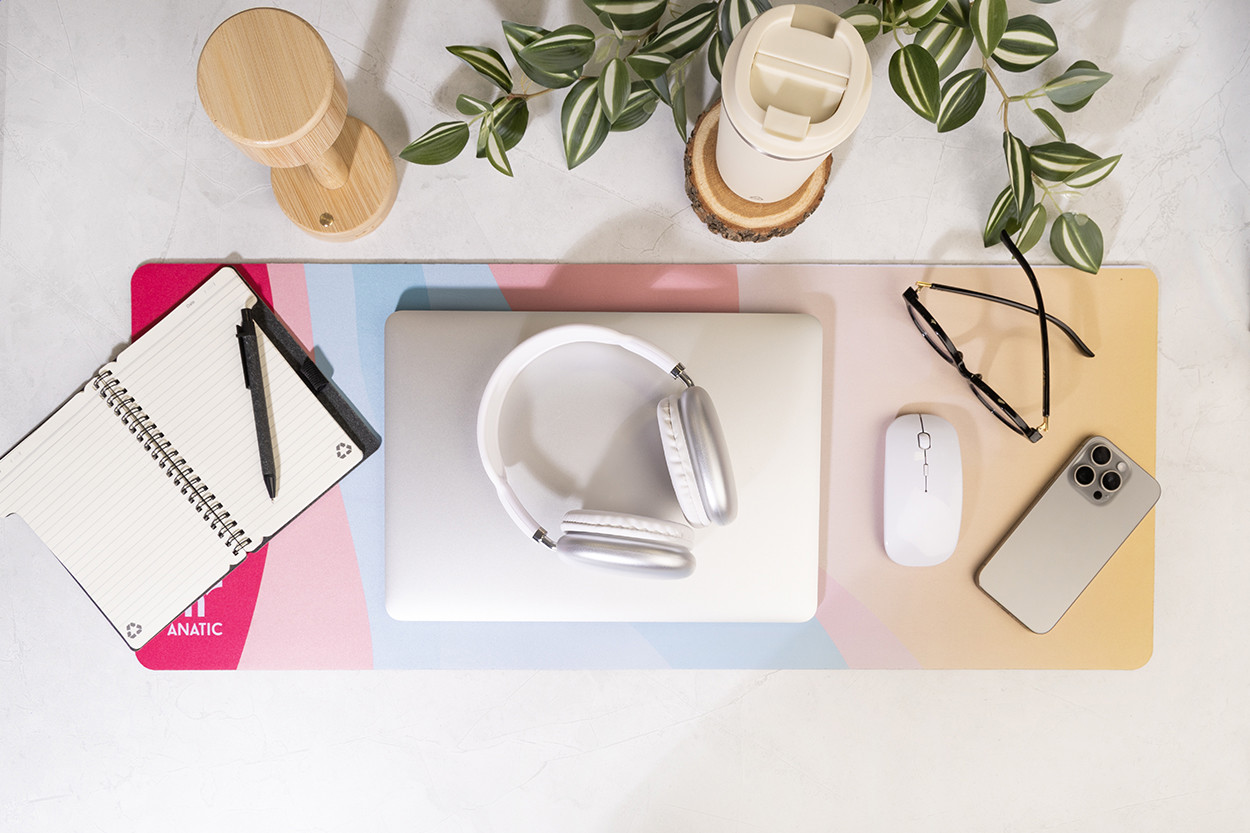 Szublimációs asztali egérpad RPET poliészterből, csúszásgátló gumi talppal.