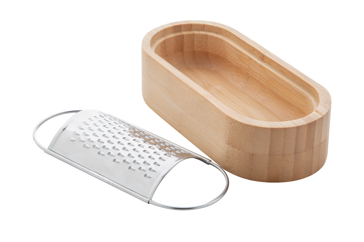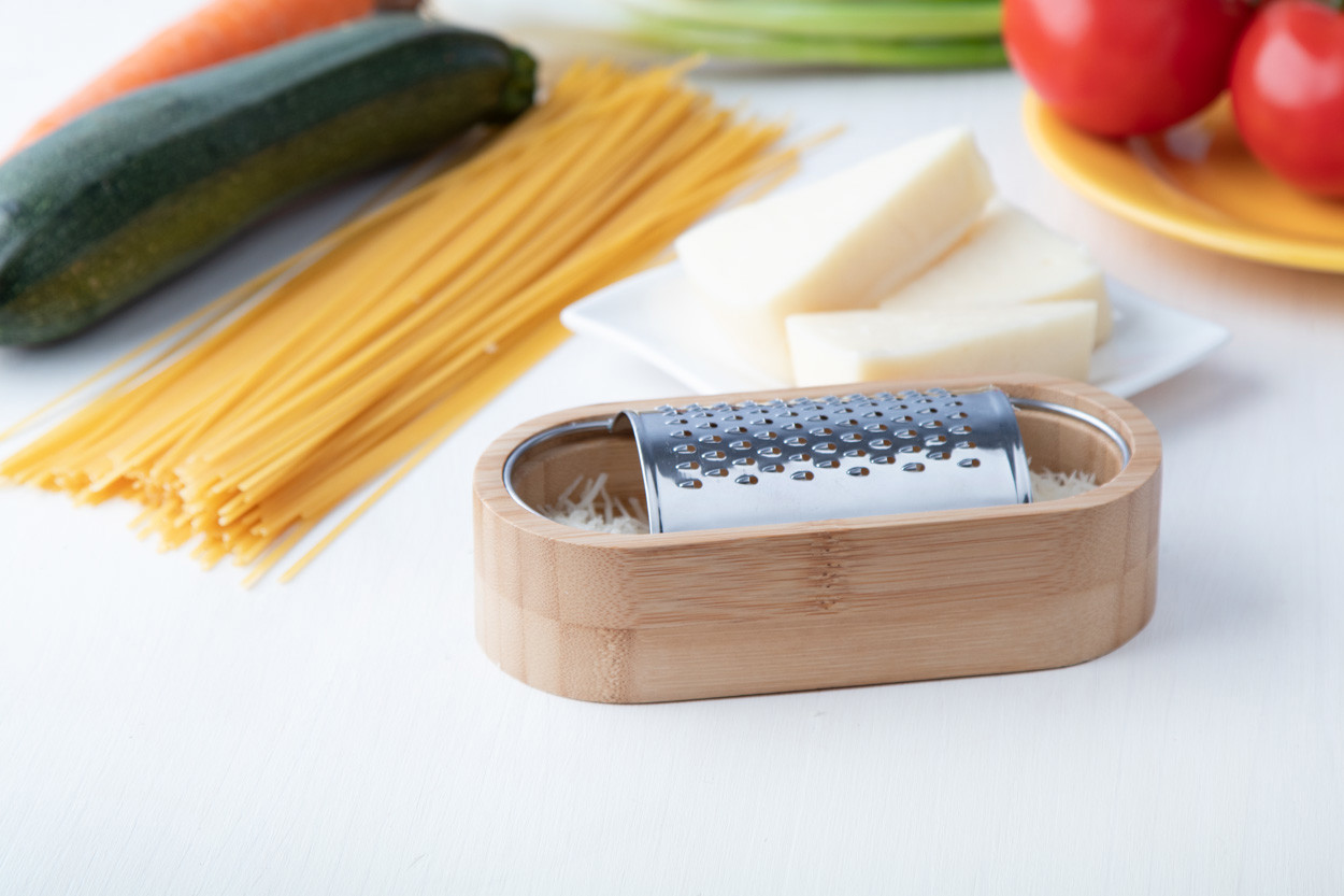 Rozsdamentes acél sajtreszelő bambusz tálkával.