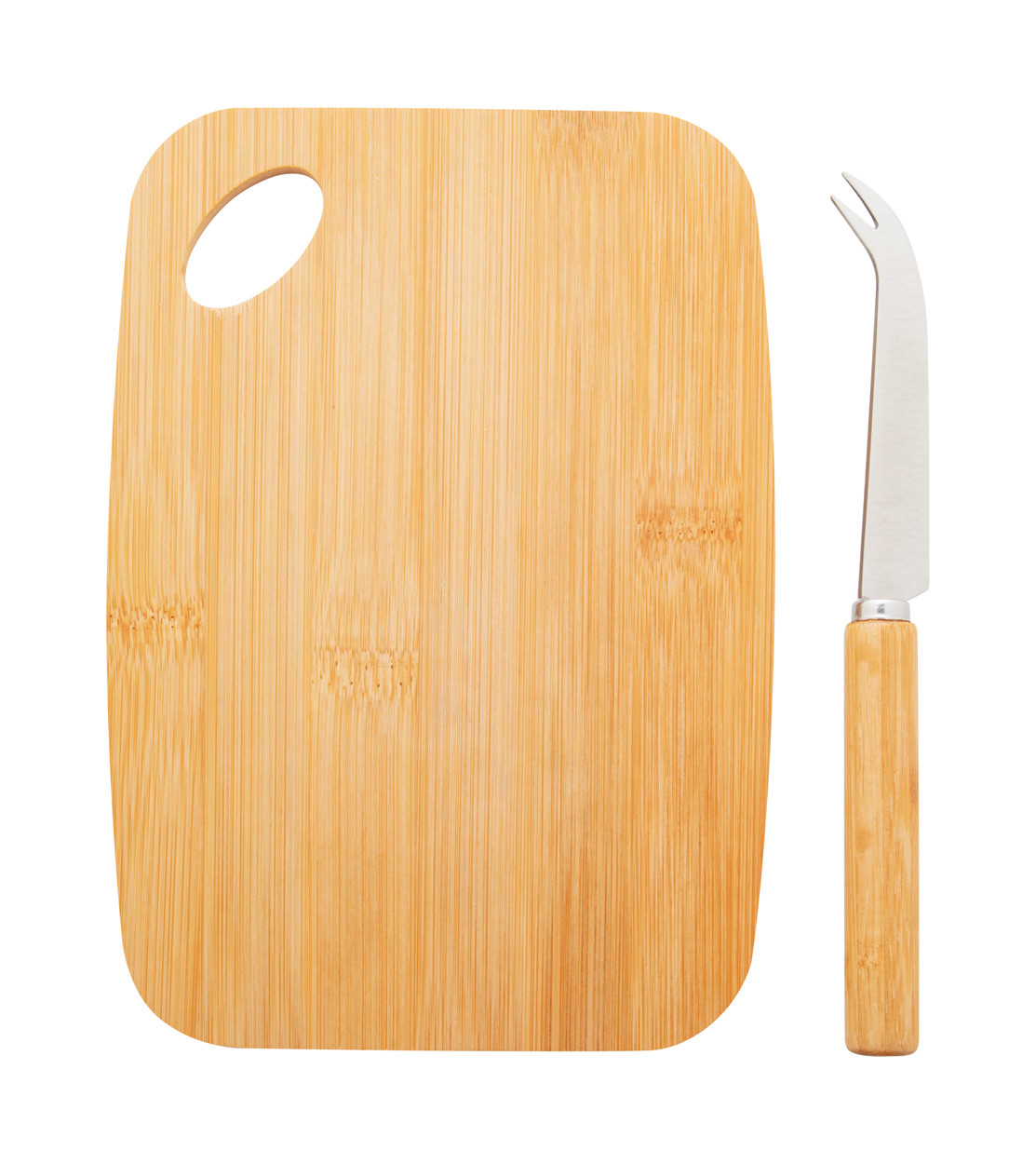 Bambusz sajtvágó készlet, rozsdamentes acél késsel és bambusz vágódeszkával. Kraft papír dobozban szállítjuk.