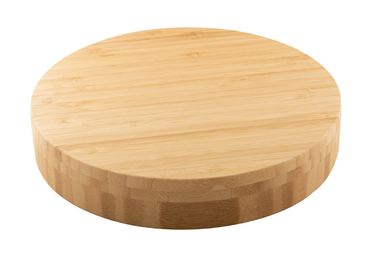 Kerek bambusz vágódeszka 4 db rozsdamentes acél sajtkéssel.