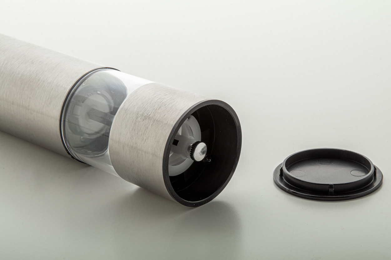 Rozsdamentes acélból készült elektromos só- és borsőrlő kerámia részlettel és LED lámpával. 4 db AA elemmel működik, elem nélkül szállítjuk.