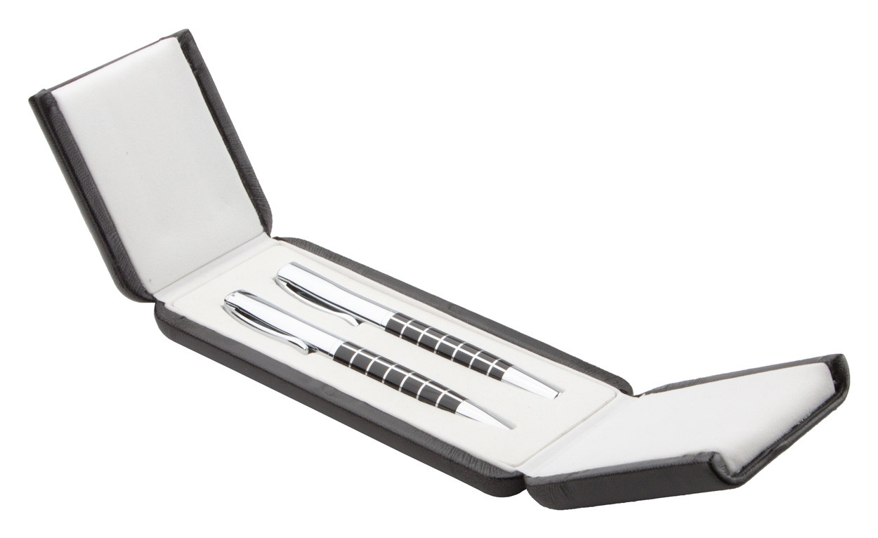 Elegáns fém golyóstoll és rollertoll szett, fénylő króm részekkel és mintás testtel. PU bőr díszdobozban, kék tollbetéttel szállítjuk. André Philippe márkatermék.