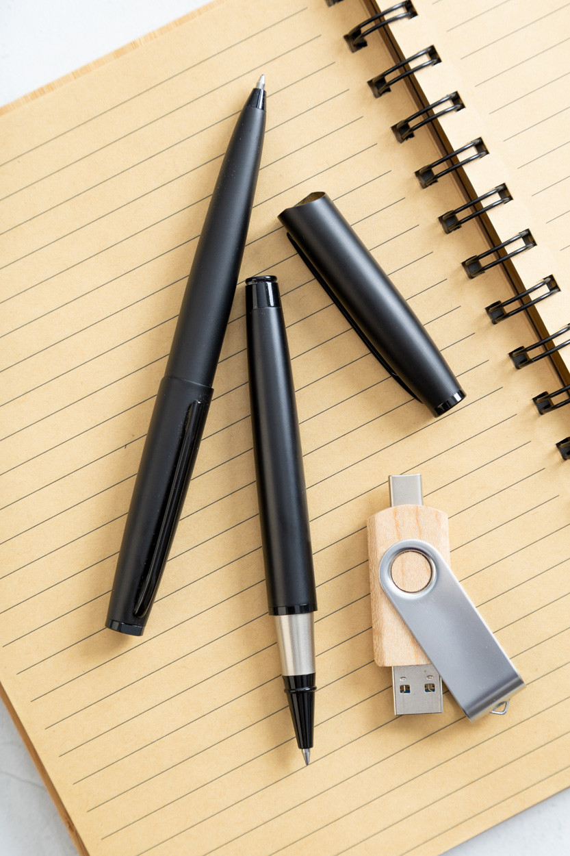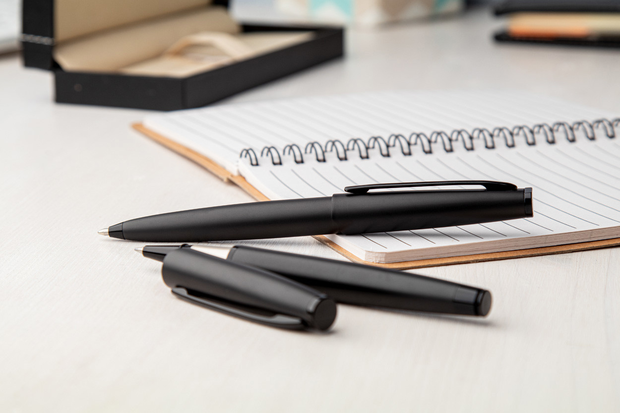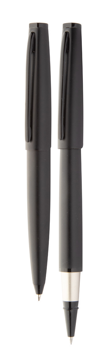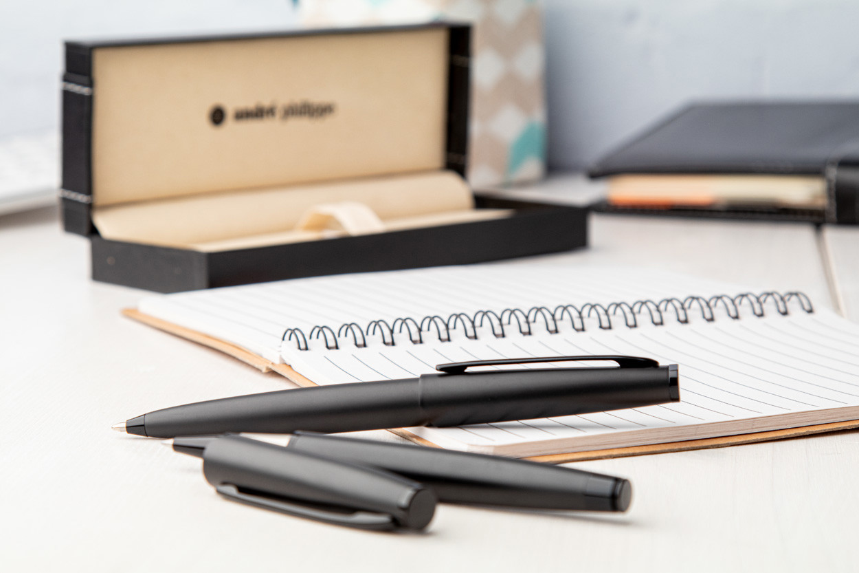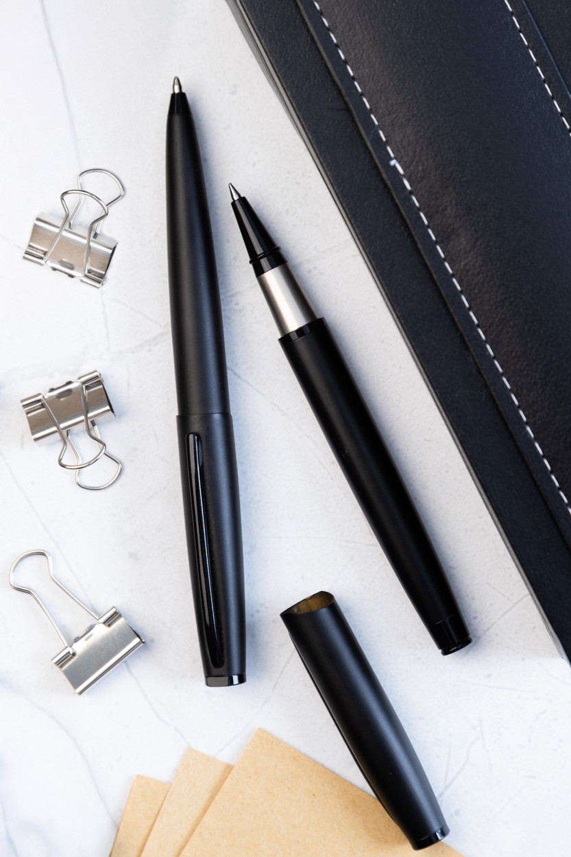 Elegáns, matt fém golyóstoll és rollertoll szett. Műbőr díszdobozban, kék tollbetéttel szállítjuk. André Philippe márkatermék.