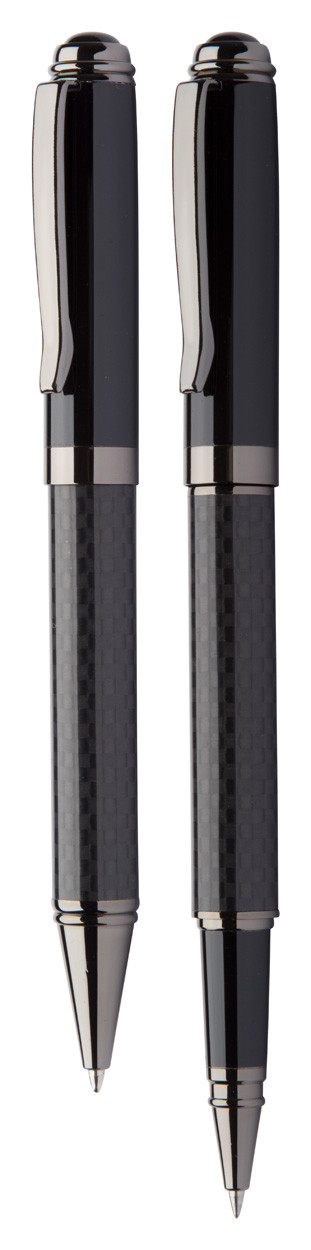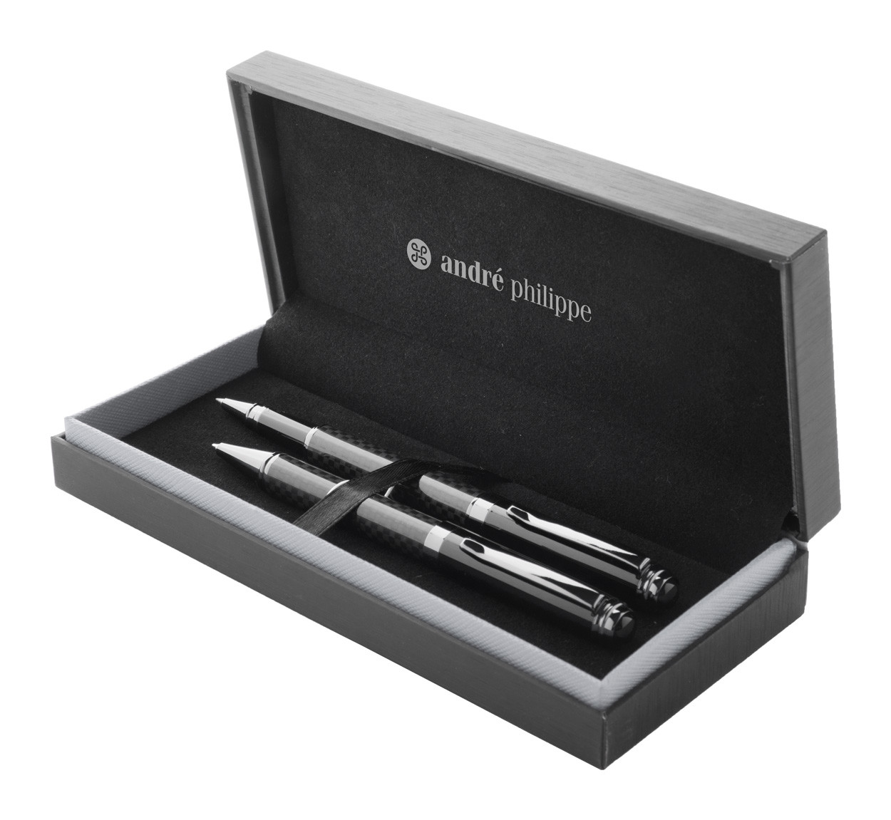 Elegáns, fém golyóstoll és rollertoll szett mintázott testtel. Fekete díszdobozban, kék tollbetéttel szállítjuk. André Philippe márkatermék.
