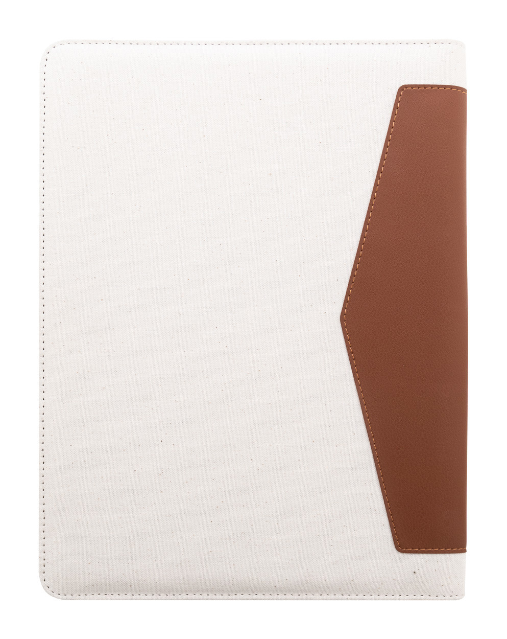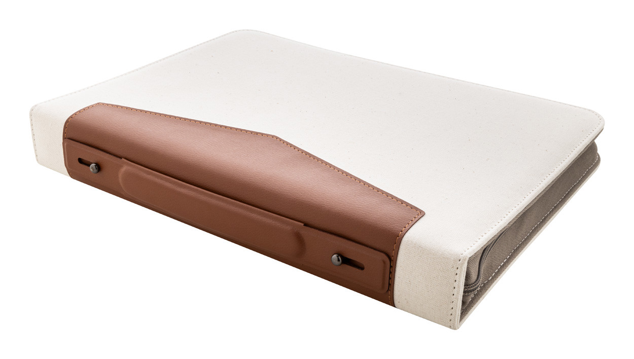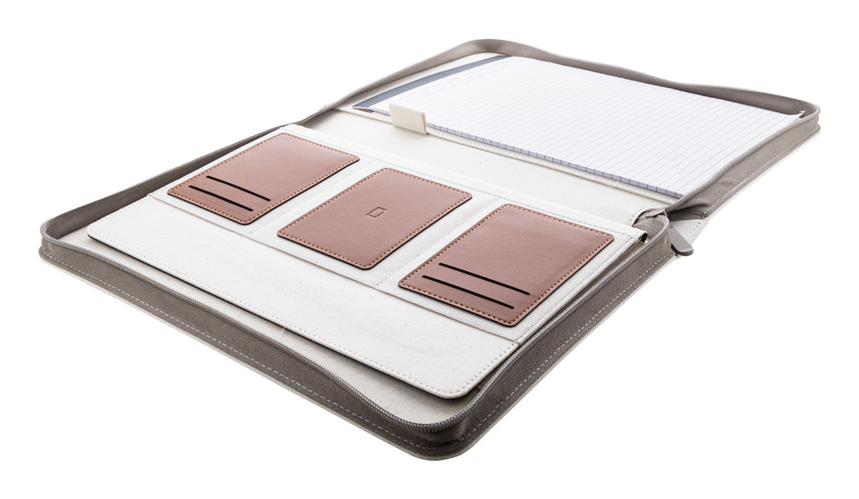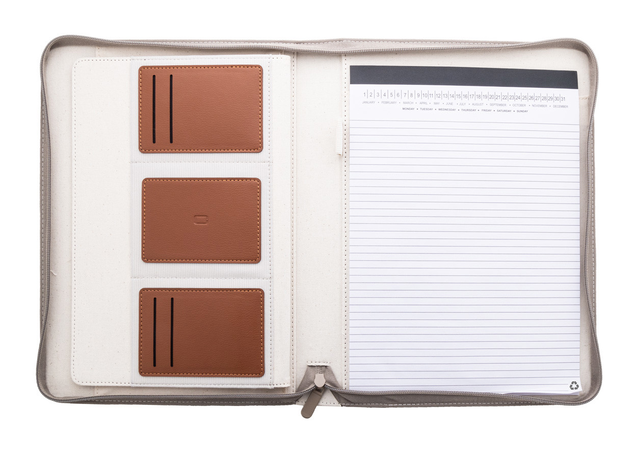 A4-es méretű, újrahasznosított vászon és újrahasznosított PU bőr, cipzáras iratmappa hordfüllel és belső rendező zsebekkel. 20 vonalas jegyzettömbbel újrahasznosított papírból. 70% újrahasznosított pamut és 30% RPET poliészter.