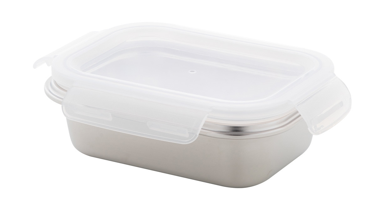 Rozsdamentes acél uzsonnás doboz, légmentesen záródó, PP műanyag fedéllel. 650 ml.