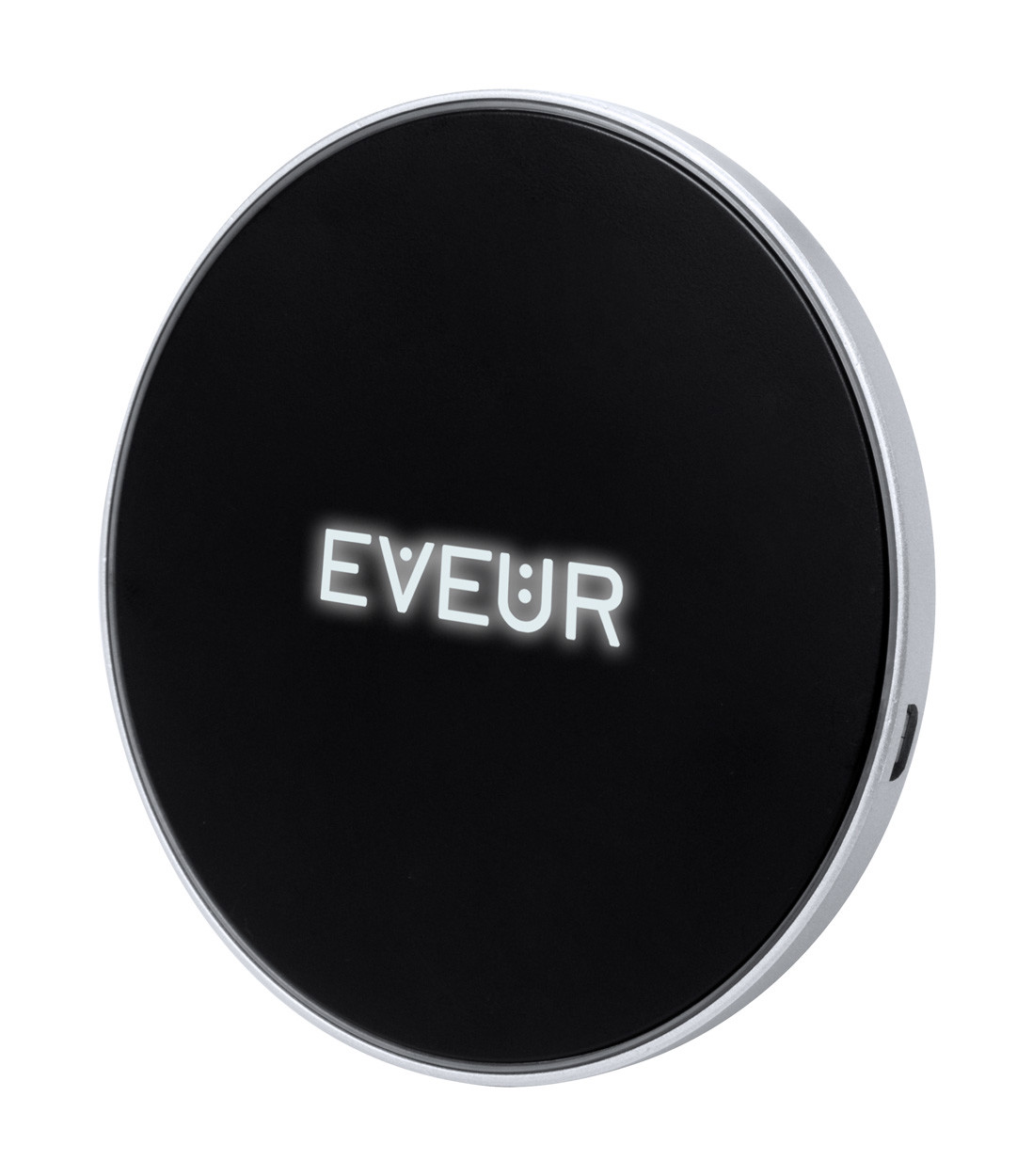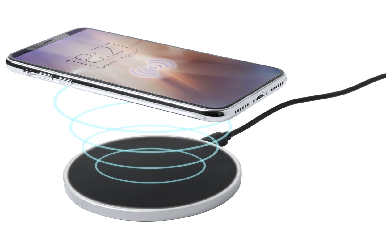 Vezeték nélküli mobiltelefon-töltő (5W) műanyag borítással és LED fénnyel, ami a gravírozott emblémát megvilágítja. USB töltőkábellel szállítjuk.