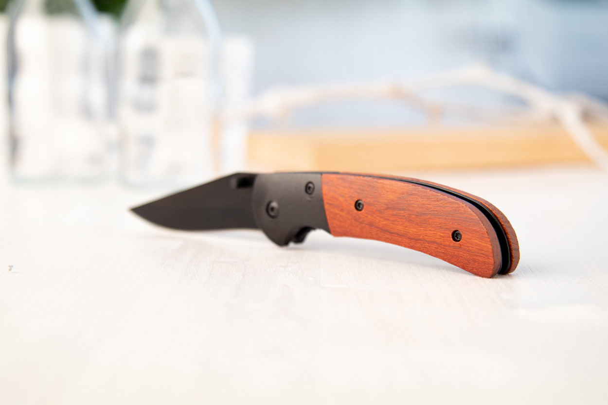 Biztonsági záras, rozsdamentes acél zsebkés, fa markolattal.